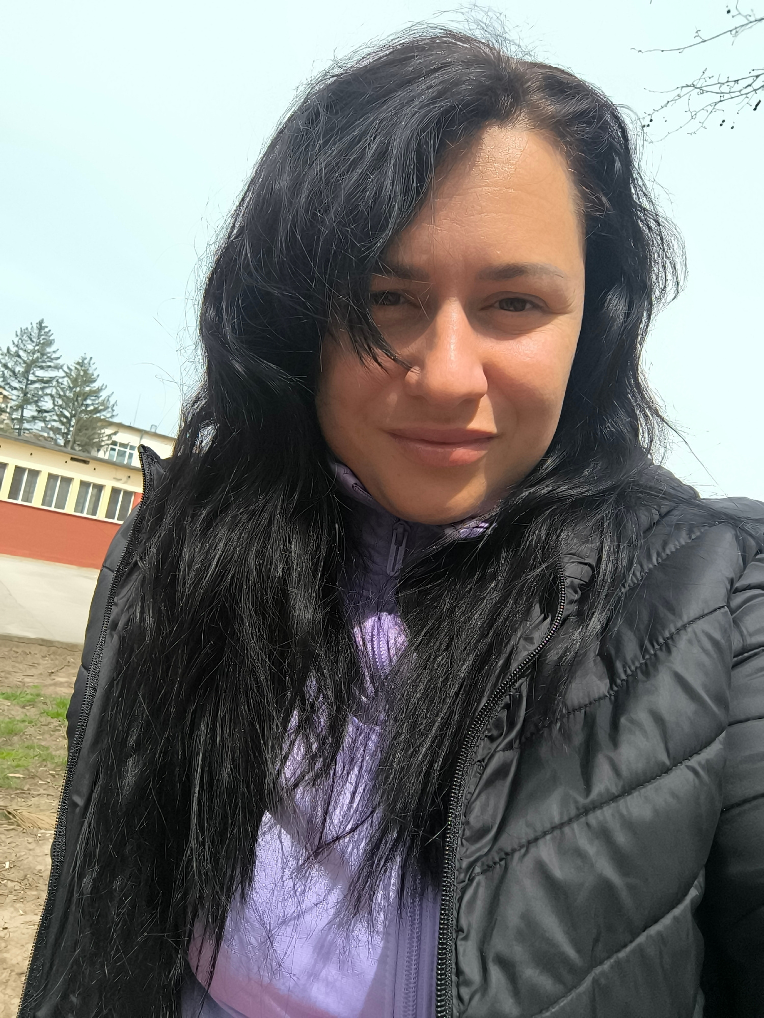 A woman with dark hair and fair skin is facing the camera. She is wearing a black puffer jacket over a light purple top. In the background, there is a red and yellow building with windows, and pine tr…read more