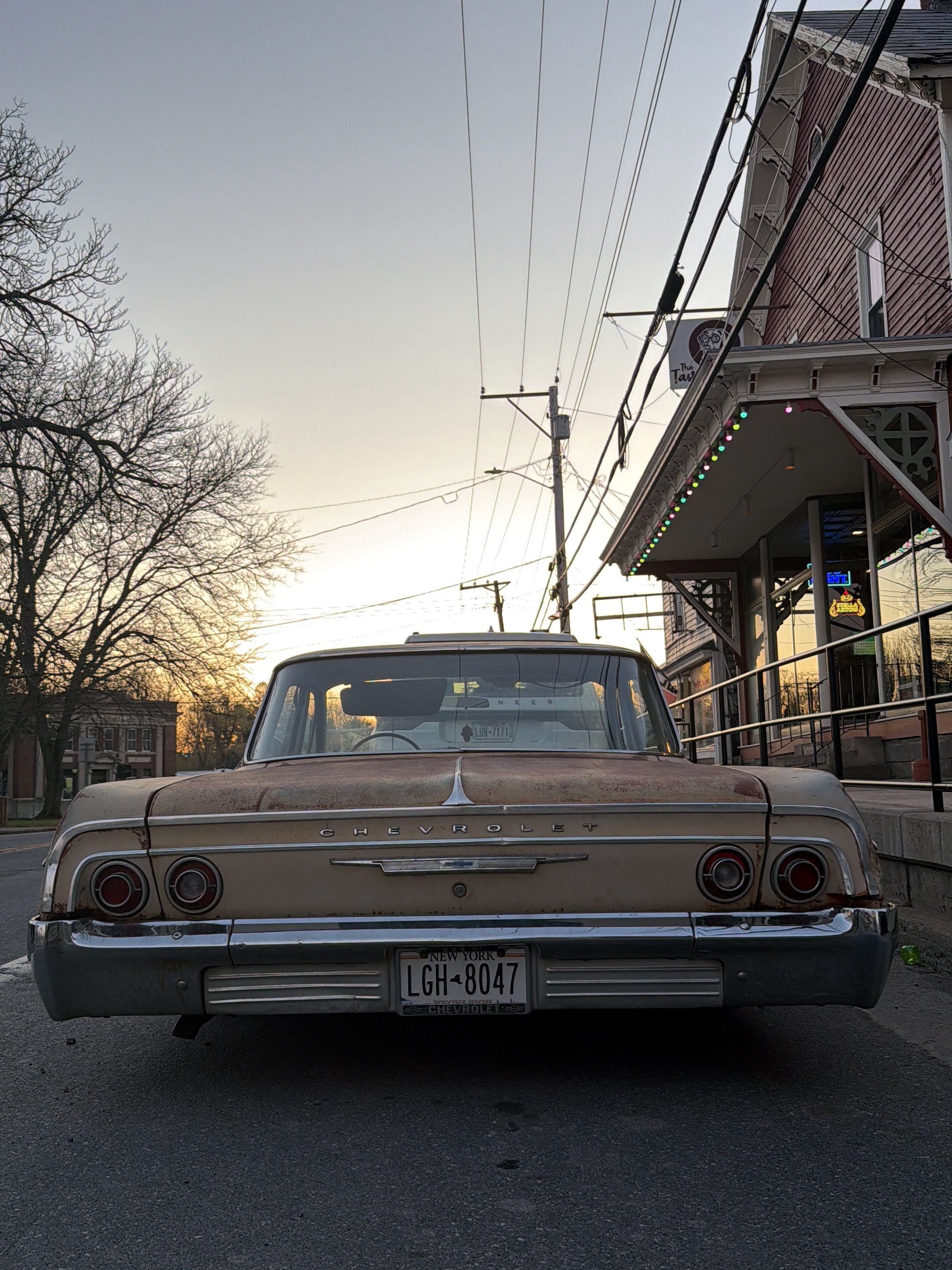 The image shows the rear of a vintage Chevrolet car parked on a street. The car has a beige body, and some rust is visible on the trunk. The car's license plate is "LGH-8047" from New York. The car's…read more