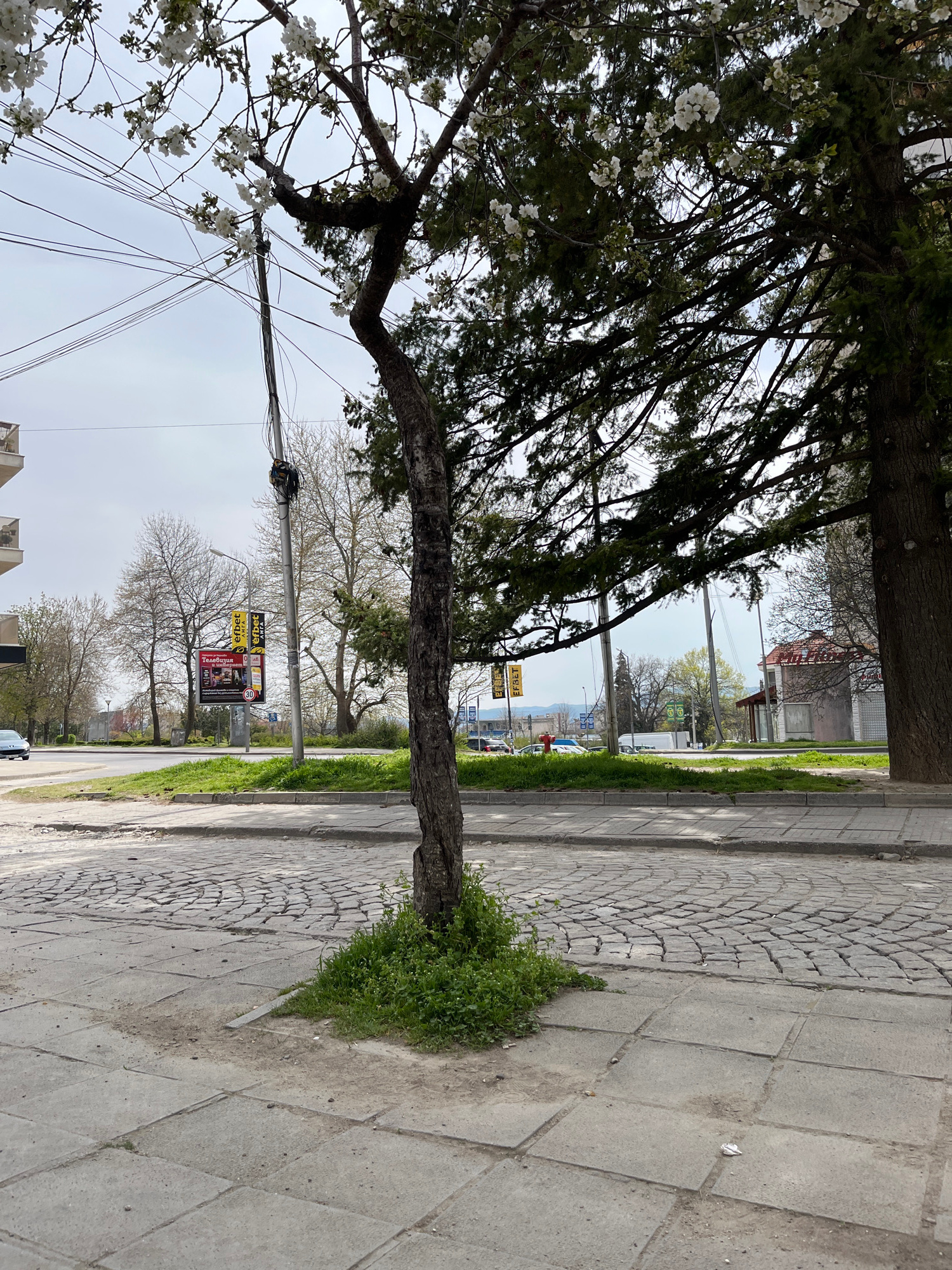The image depicts a street scene in Karlovo, Bulgaria, characterized by a tree planted directly into the paved sidewalk, with grass growing around its base. The sidewalk is constructed of both square…read more