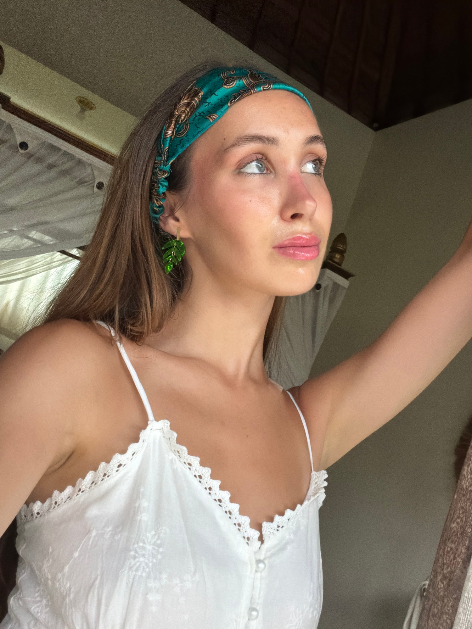 A woman with light skin is captured in a close-up, slightly angled shot. She is wearing a white summer dress with a lace trim and thin straps. A blue and gold patterned headband adorns her hair, and s…read more
