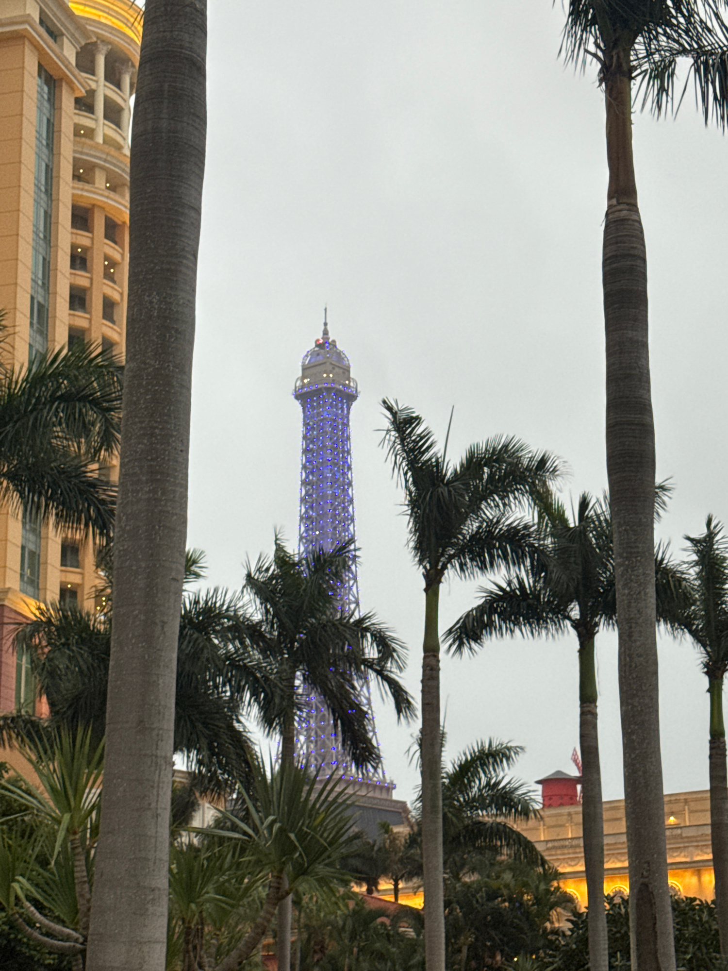 A view of the Eiffel Tower replica within The Parisian Macao in Macao, China, is framed by multiple palm trees. The tower is lit up with blue lights. Buildings are visible on either side, suggesting a…read more