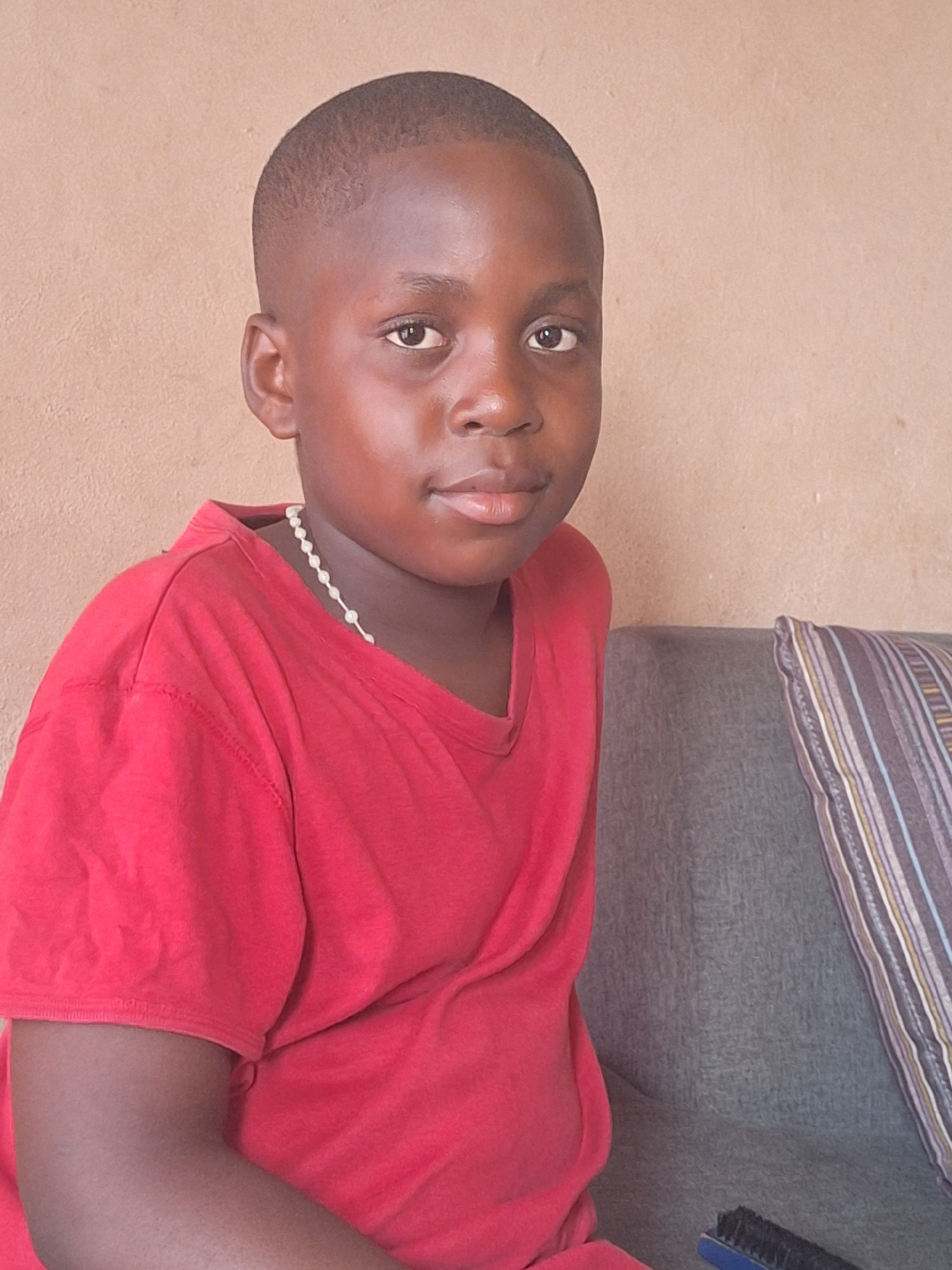 A young Black person with short hair is sitting indoors, likely in a home. They are wearing a red shirt and a white beaded necklace. The background consists of a beige wall, a gray couch with a stripe…read more