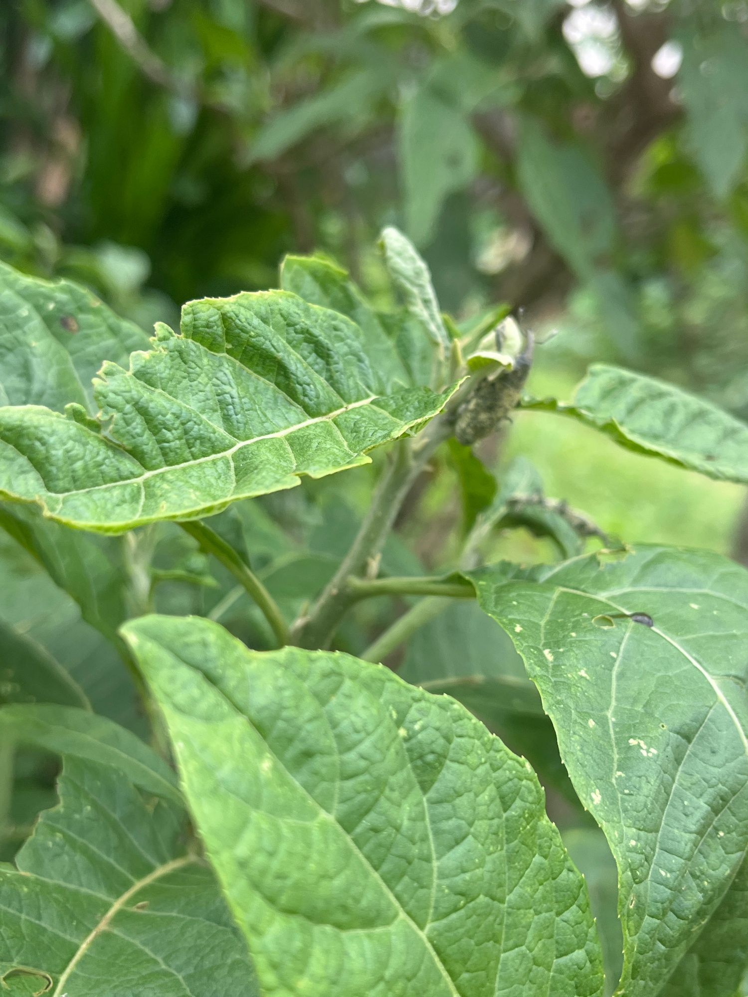 This close-up shot features lush green foliage, likely from a plant or bush, dominating the frame. The primary subjects are several large, textured leaves. Many of these leaves display a slightly crin…read more
