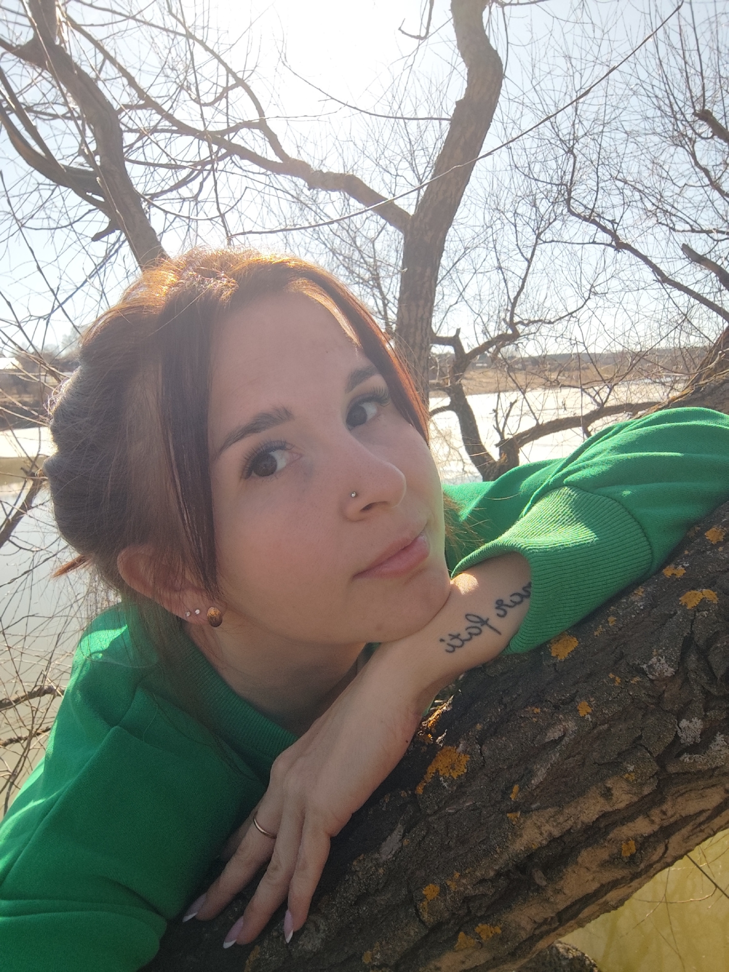 A young woman with reddish-brown hair is featured in a close-up, outdoor portrait taken in Фоки, Russia, during bright daylight. Her hair is styled with some strands framing her face, glistening in th…read more