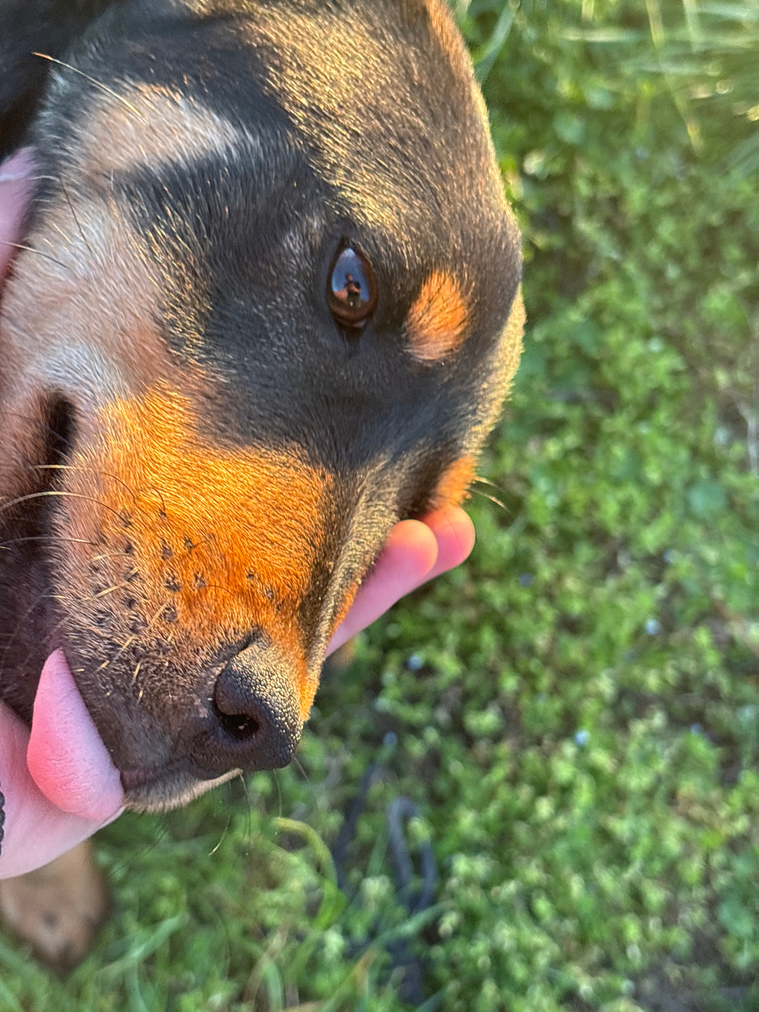 A close-up shot captures the head of a dog, predominantly black with tan markings, held gently by a human hand. The dog's tongue protrudes slightly. The background shows blurred greenery, and the shot…read more