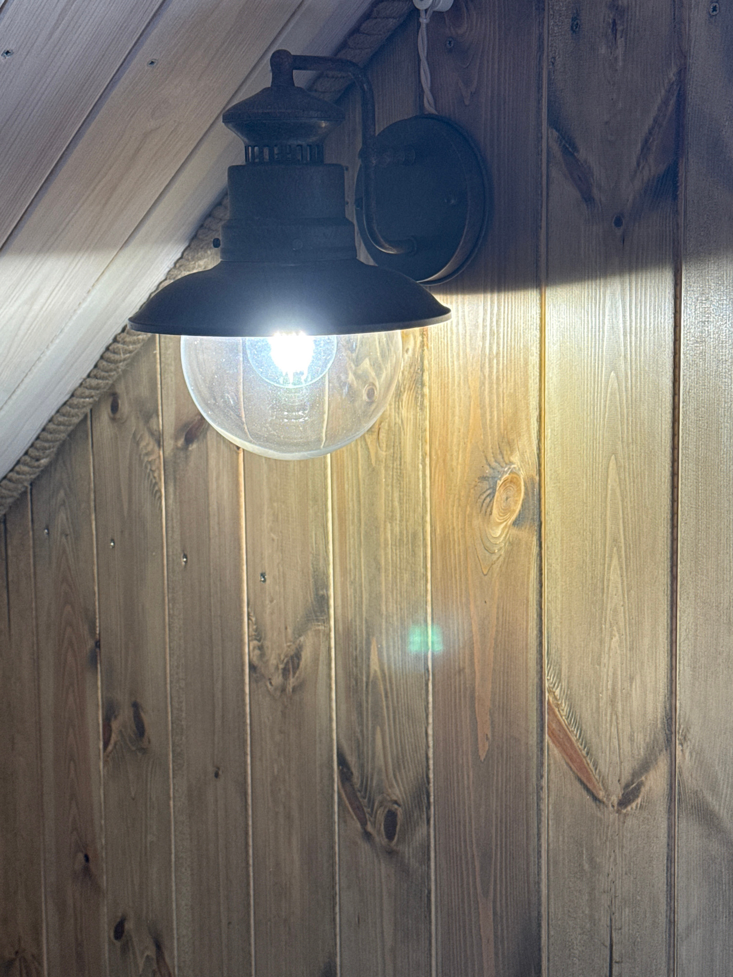 A low-angle shot reveals a room interior, possibly in Tyulyuk, Russia, given the prompt's context. The walls and ceiling are paneled with light-colored wood. A wall-mounted light fixture is attached t…read more