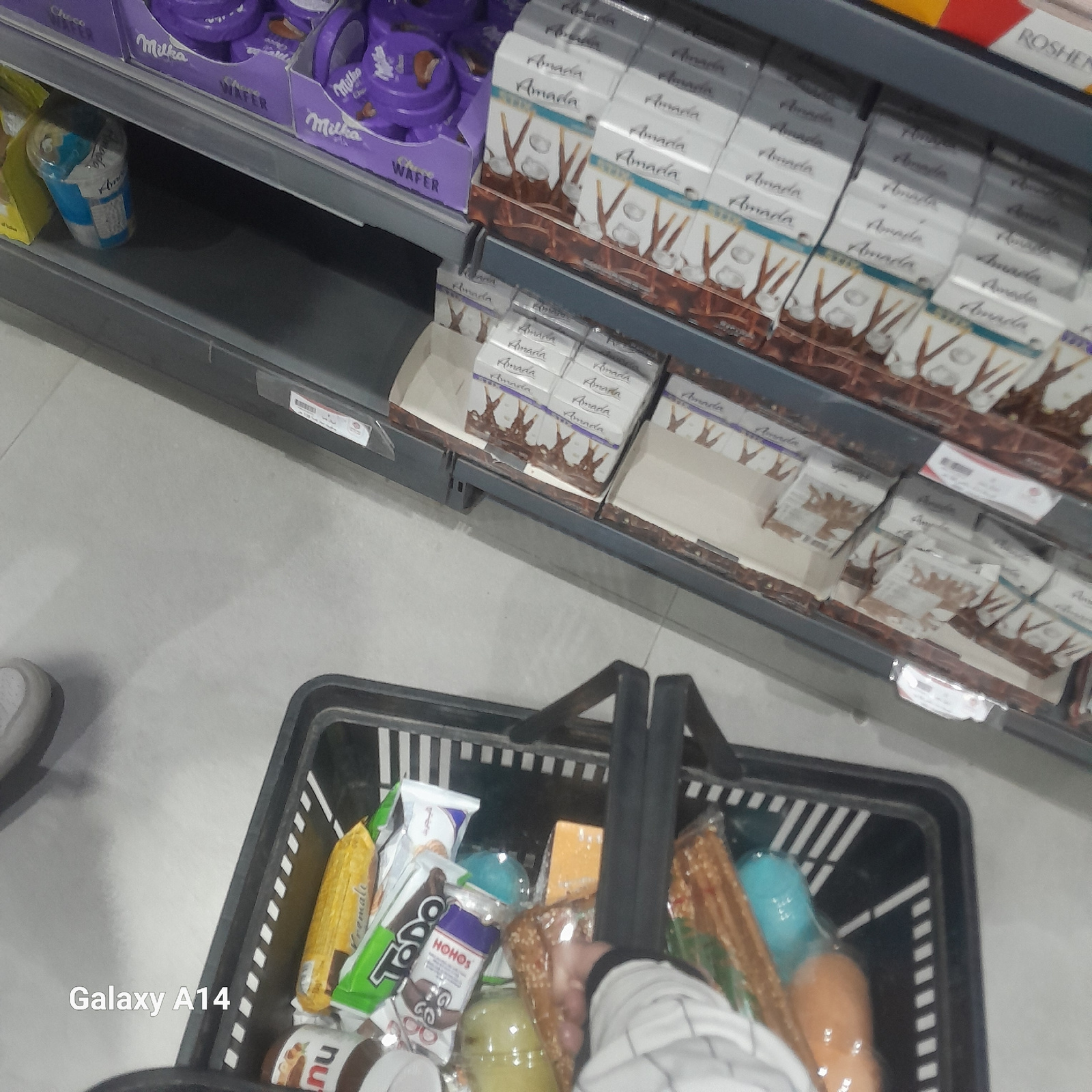 This image appears to have been taken inside a grocery store in the city of Nuseirat, Palestinian Territory. It shows a shelf stocked with chocolate and candy products, including brands such as Milka…read more
