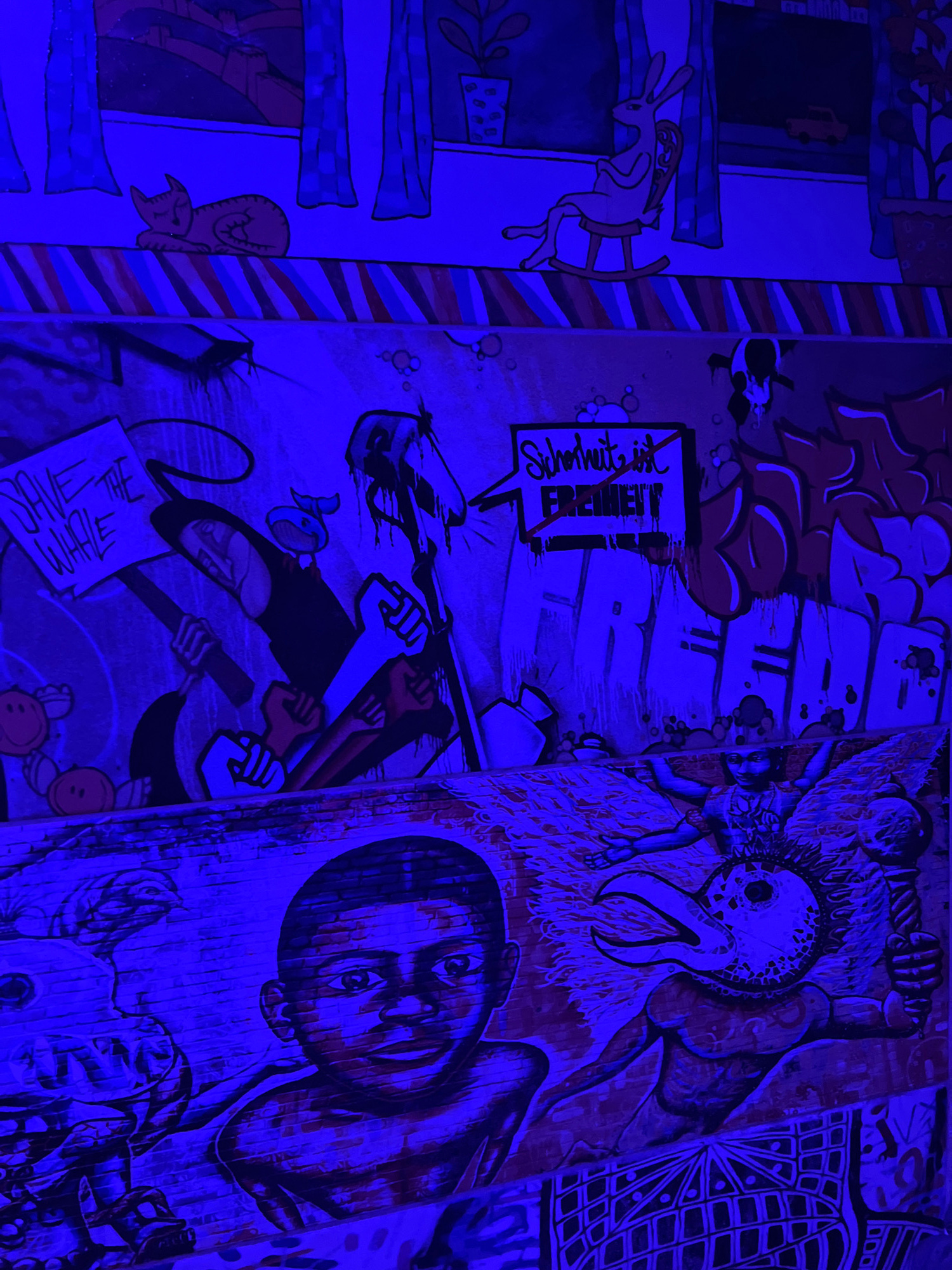 The image shows a mural in Minsk, Belarus. It consists of several panels. The left panel contains a cartoon image of a rabbit on a rocking horse in front of a building. The middle panel shows the word…read more