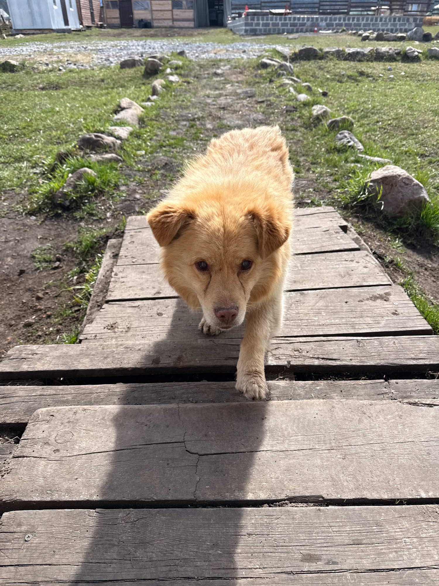 A medium shot shows a medium-sized, light-brown dog lying on a wooden walkway in Tyulyuk, Russia. The walkway is constructed of rough-hewn planks, with dark, deep crevices between them. The dog has so…read more
