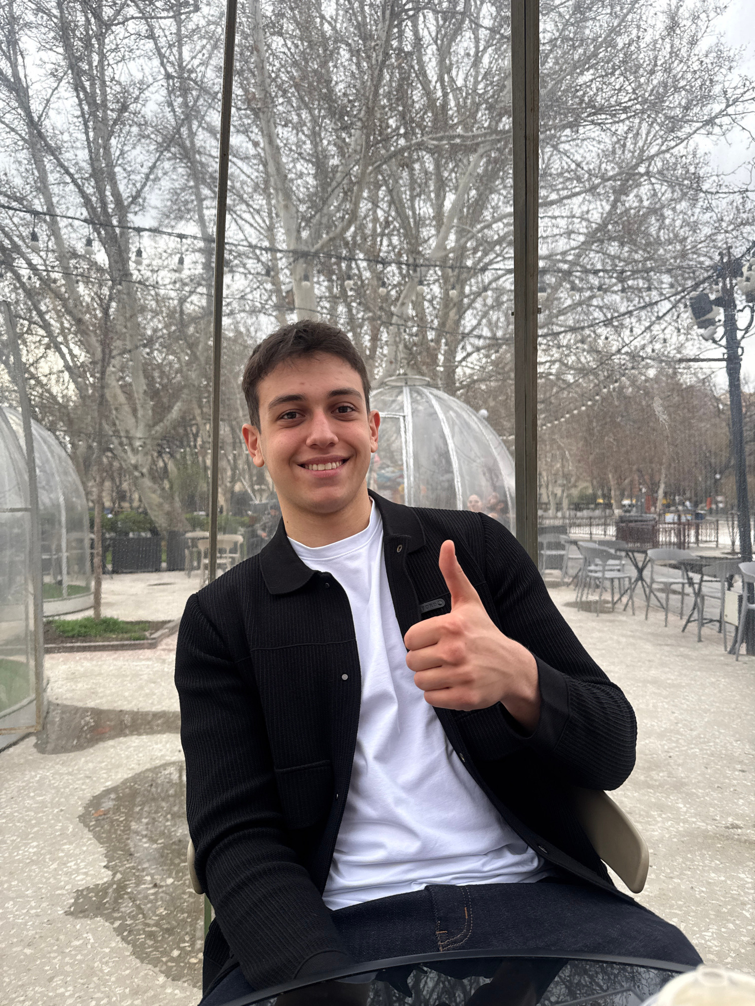 A young man is shown in the image, seated outdoors and giving a thumbs-up. He is wearing a white t-shirt under a black sweater or jacket, and dark jeans or pants. The background indicates he is in an…read more