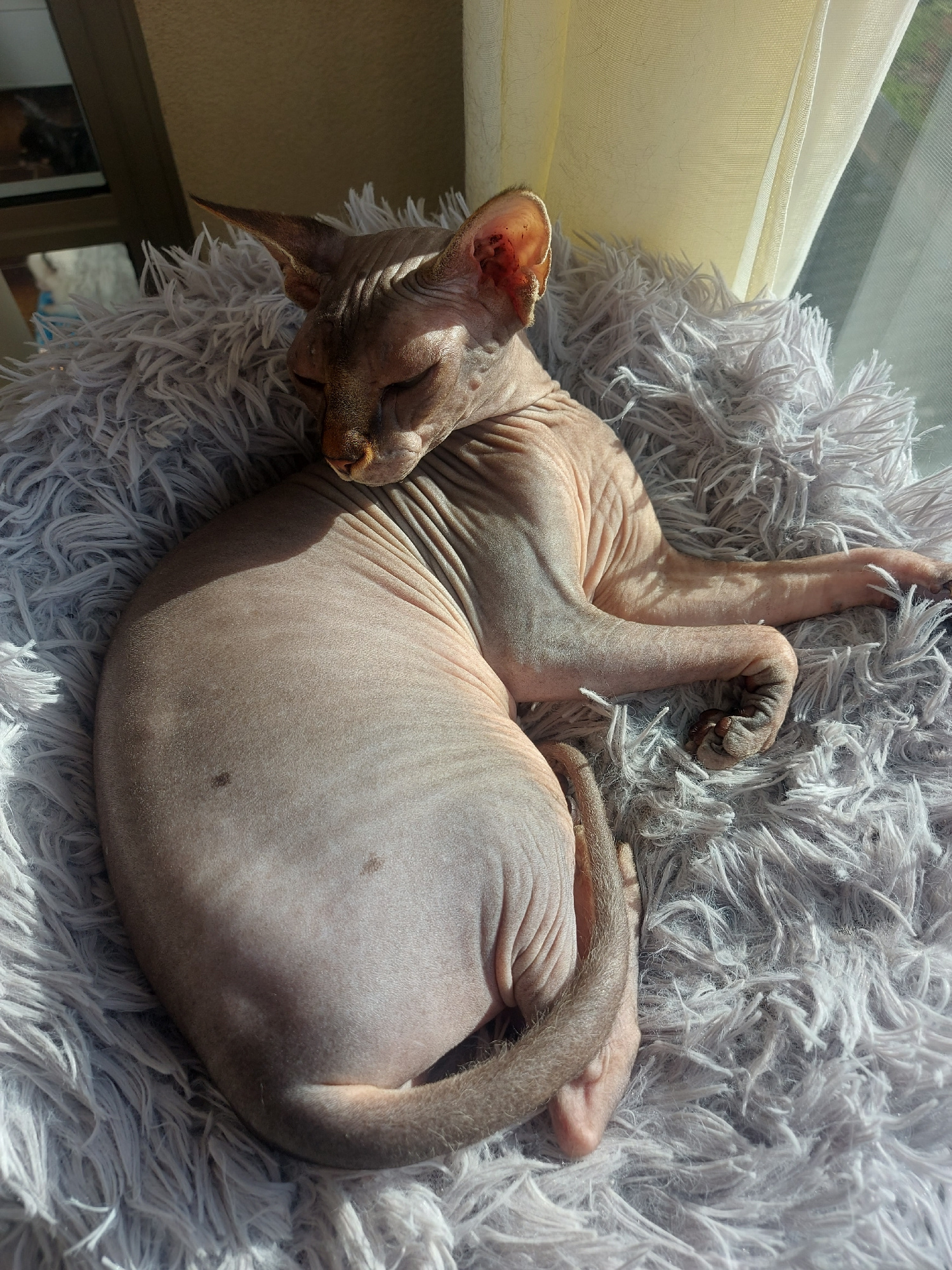 A hairless Sphynx cat is curled up asleep on a light grey, shaggy faux fur blanket. The cat's head is positioned at the top left of the frame, its body curled around to the right. The cat's limbs areβ¦read more