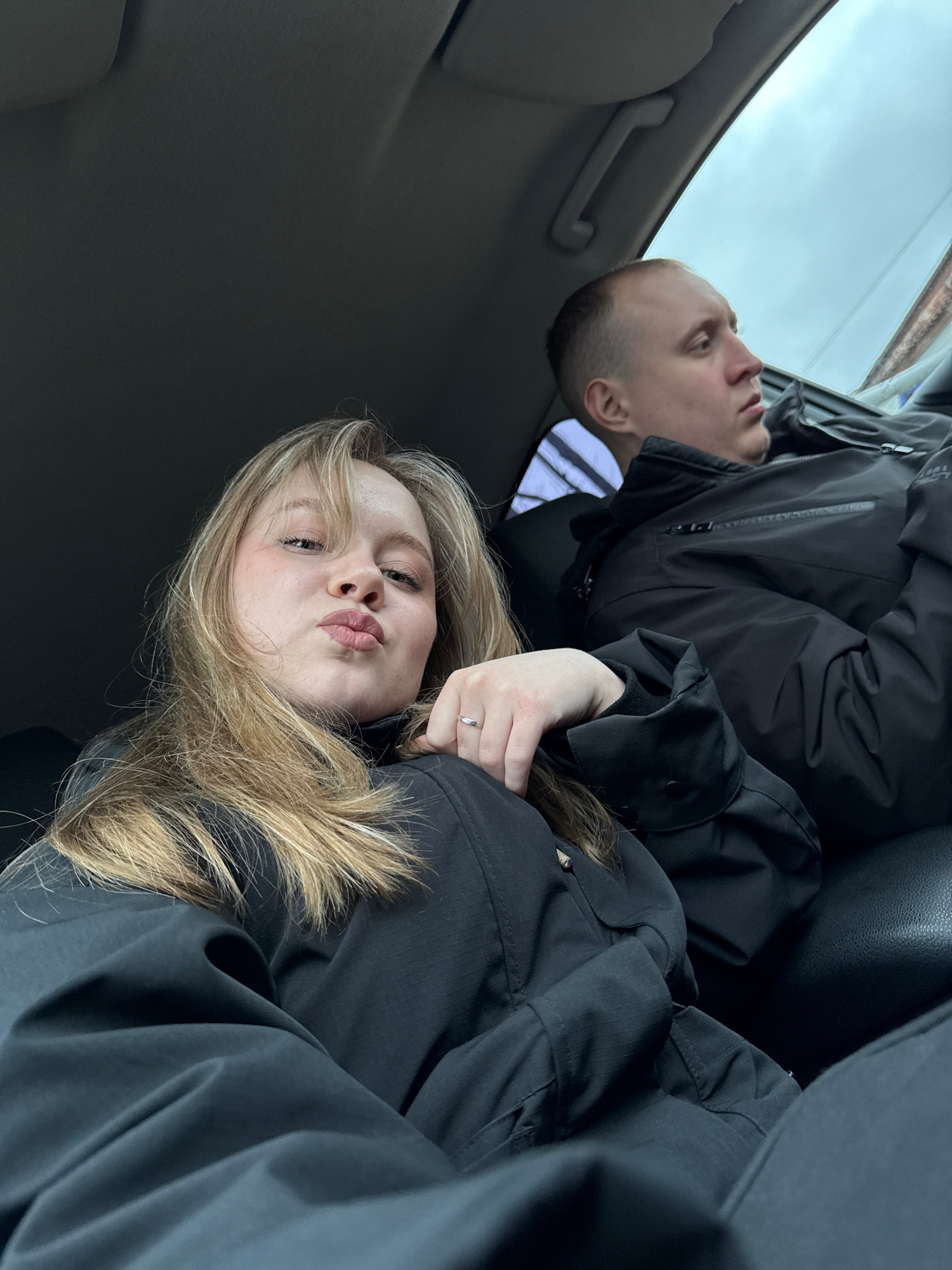 A low-angle, tilted photograph captures a young man and woman seated inside a car, likely in Chaikovsky, Russia. The woman, positioned closer to the camera, has long blonde hair and fair skin, looking…read more