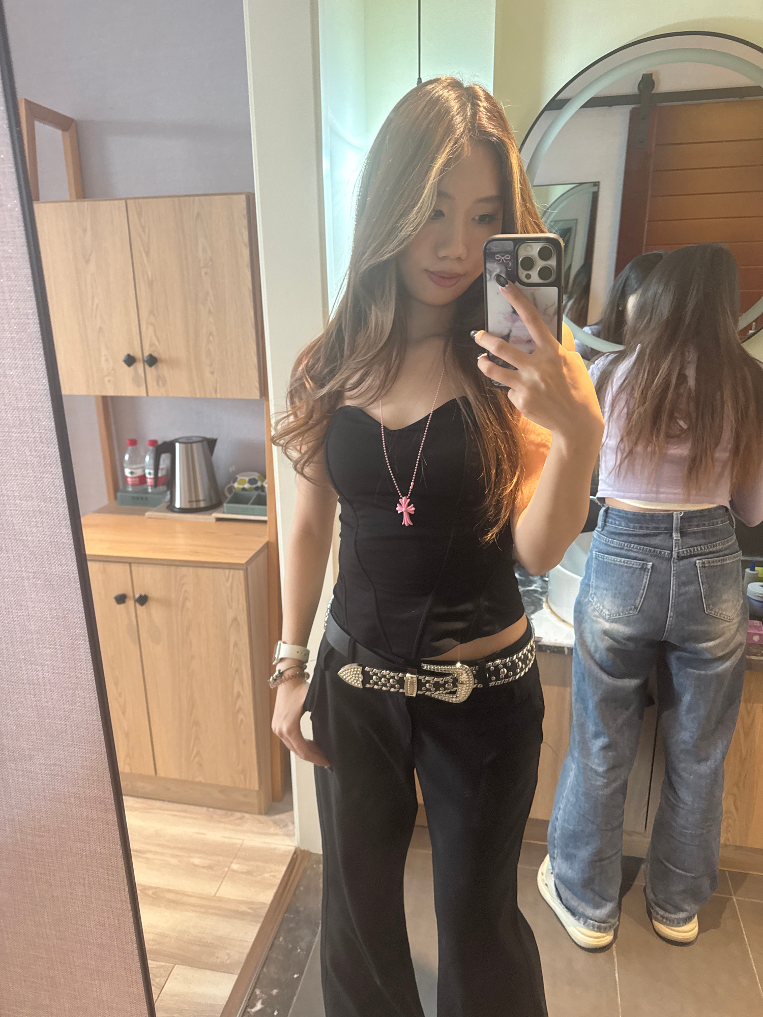 The image is a mirror selfie taken by a young woman in an indoor setting, likely in Jiayuguan, China. The main subject, reflected in the mirror, is a young woman with long, light brown hair, looking…read more
