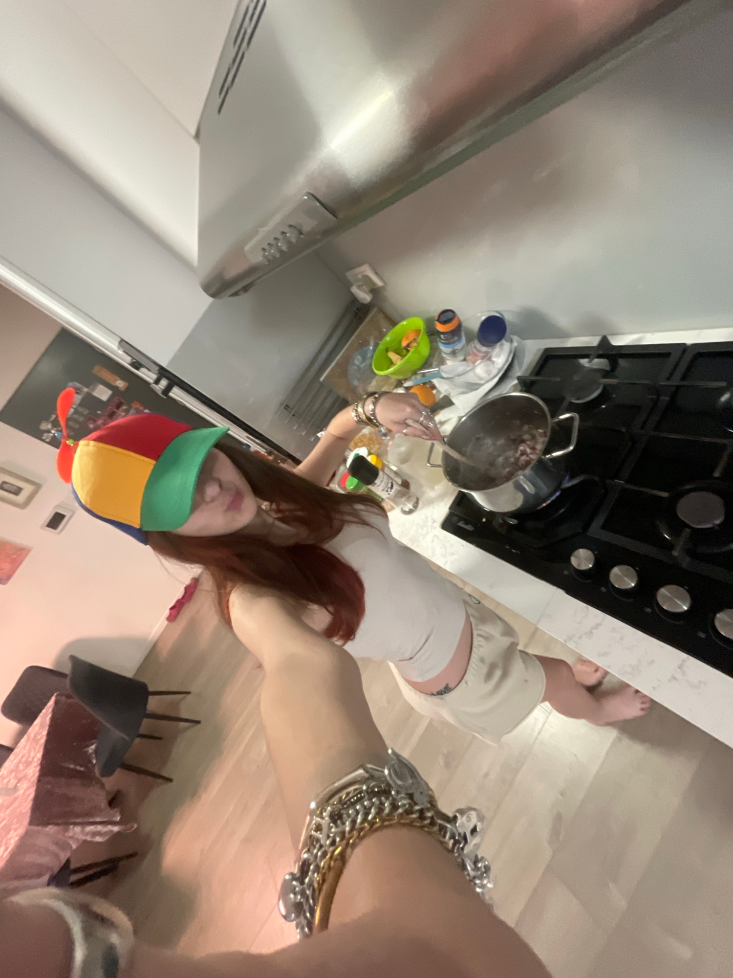 A woman wearing a multi-colored propeller hat and jewelry on her wrist and arm is cooking at a gas stove. She is stirring a pot of beans. The location appears to be a kitchen in Raanana, Israel, based…read more