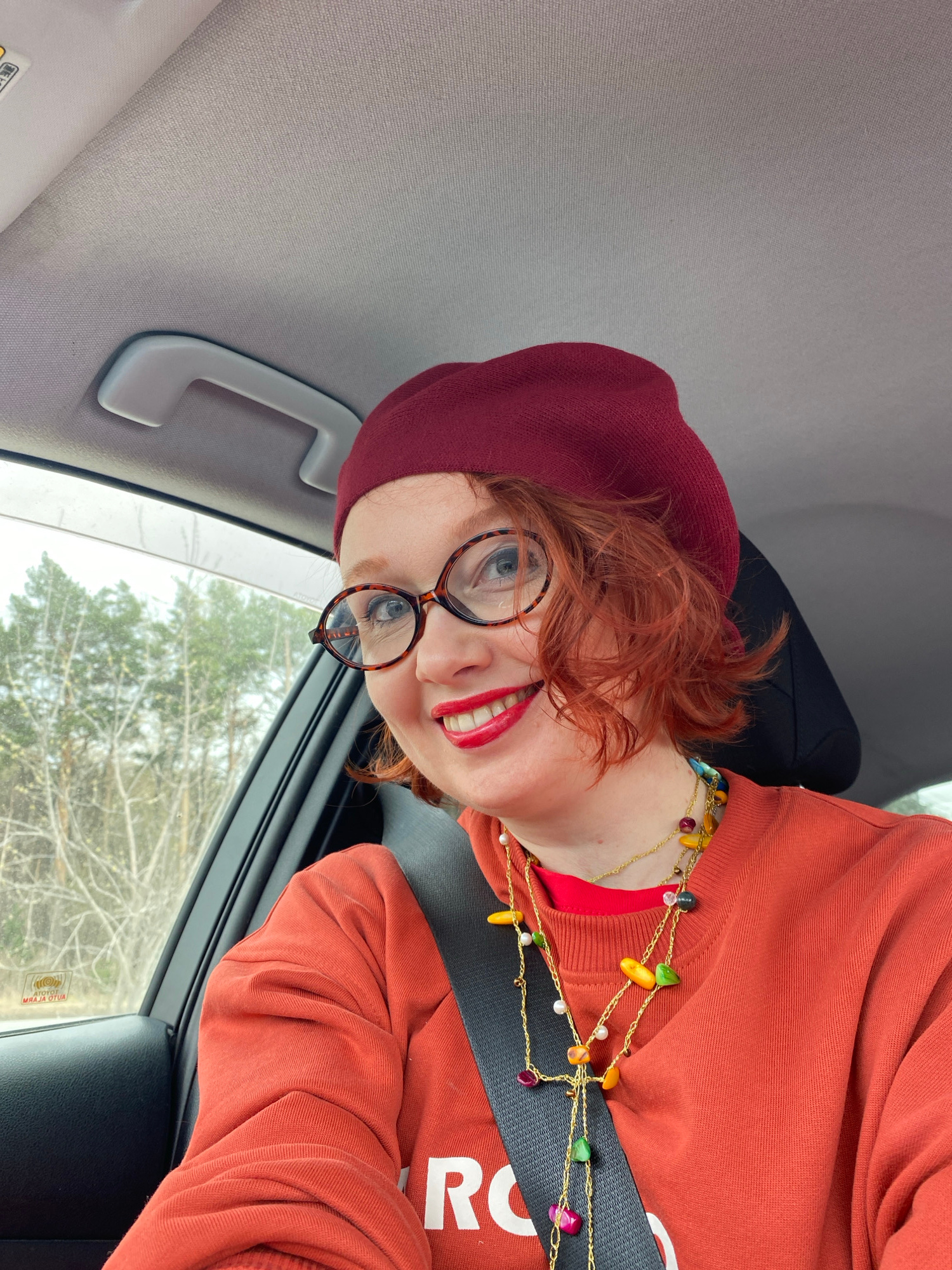 The image features a cheerful woman with reddish-orange curly hair and blue eyes, smiling broadly while seated in a car. She is wearing round, tortoise-shell frame glasses, bright red lipstick, and a…read more
