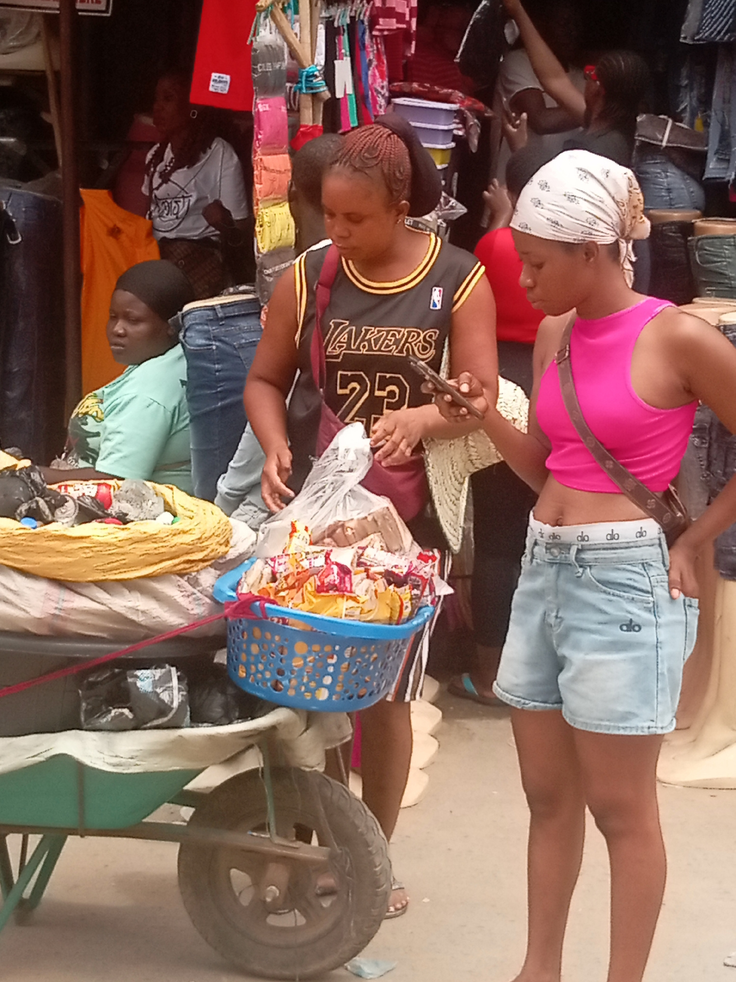 The image captures a street scene in Fegge, Nigeria, where commerce appears to be taking place. A woman wearing a black and yellow Lakers jersey is examining a blue basket filled with packaged food itβ¦read more