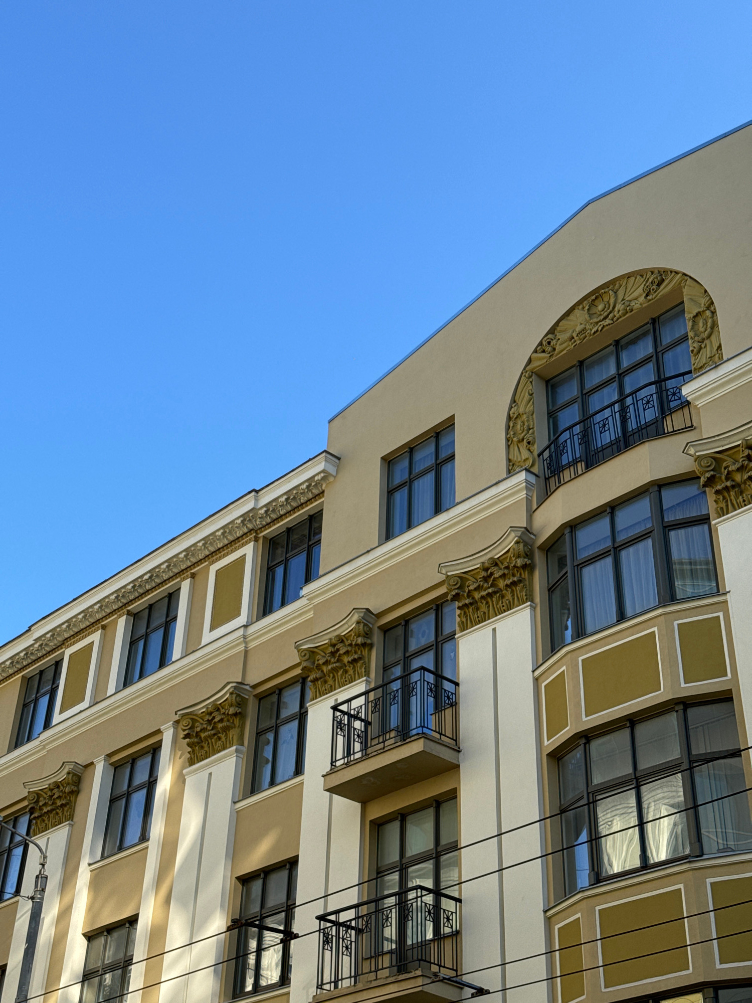 The image displays an upward, angled view of a multi-story building facade in Riga, Latvia, against a clear blue sky. The architecture exhibits an eclectic style with prominent Art Nouveau elements, f…read more