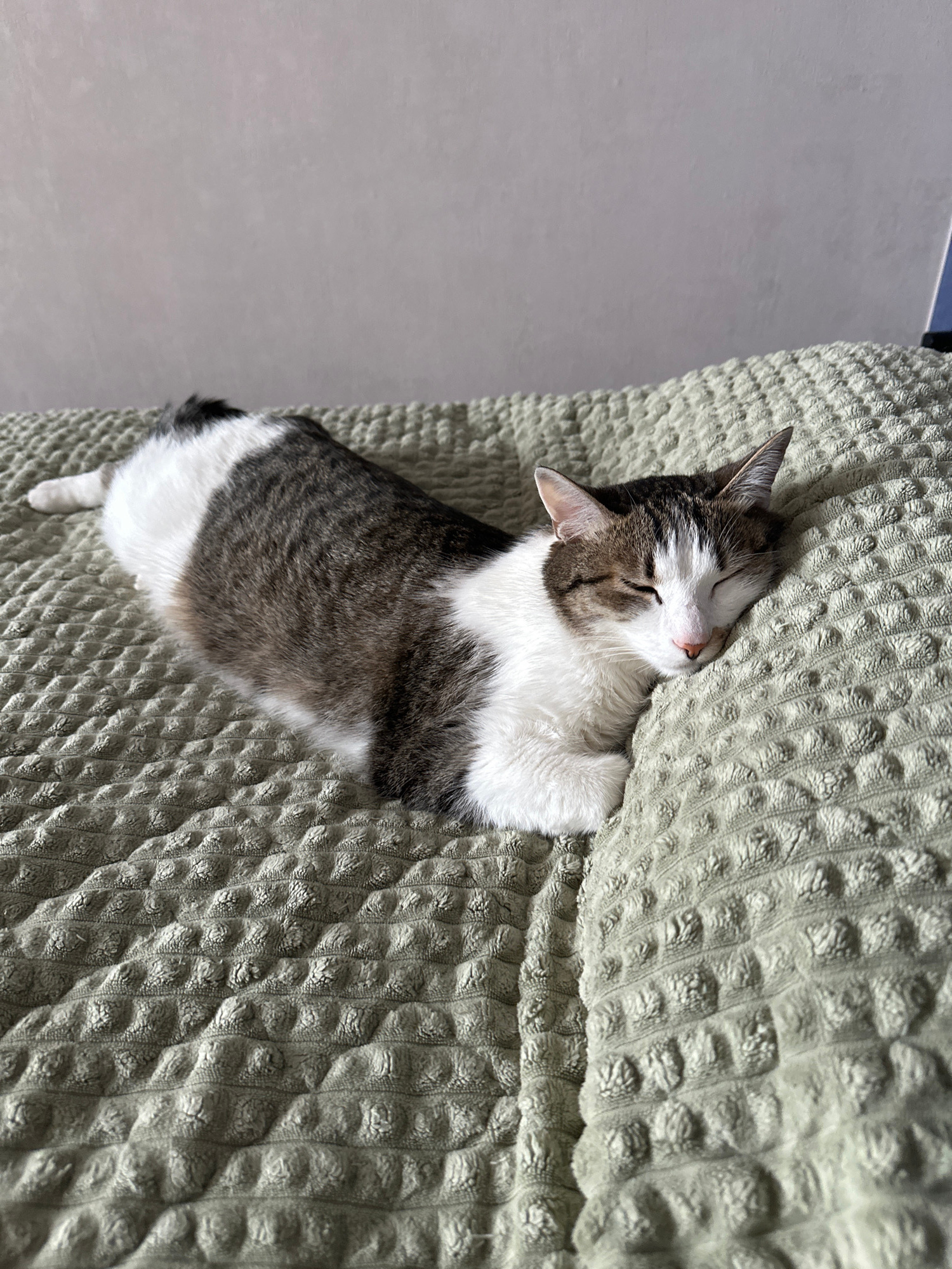 A tabby and white cat is lying on a bed covered with a textured, sage-green blanket. The cat is positioned mostly on its side with its head resting against the blanket, eyes closed, suggesting it is a…read more