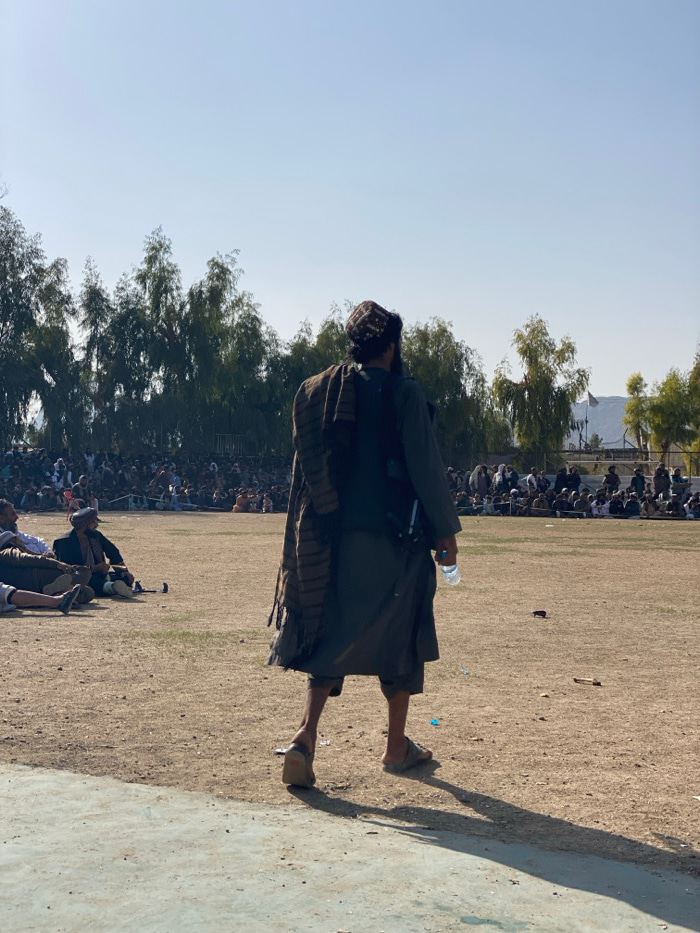 An outdoor scene in Kandahar, Afghanistan, under a clear sky, depicting a large gathering. A male figure, viewed from the back, walks rightward across a dry, unpaved dirt field. He wears a dark tunic,…read more