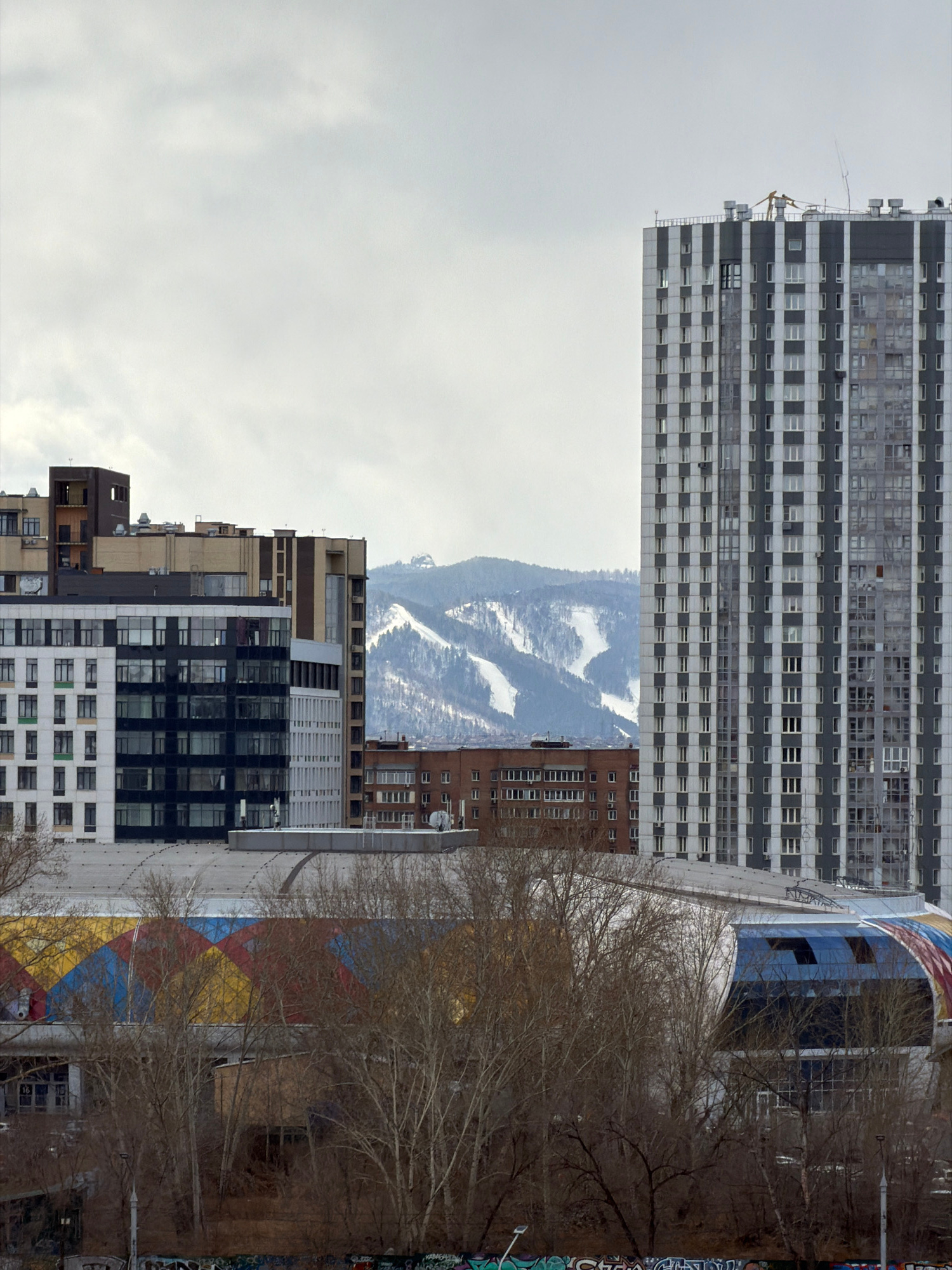 The image shows a view of the city of Krasnoyarsk, Russia. The perspective is angled, with the top of the frame dominated by a tall, rectangular building with a grid-like pattern of windows. Below and…read more