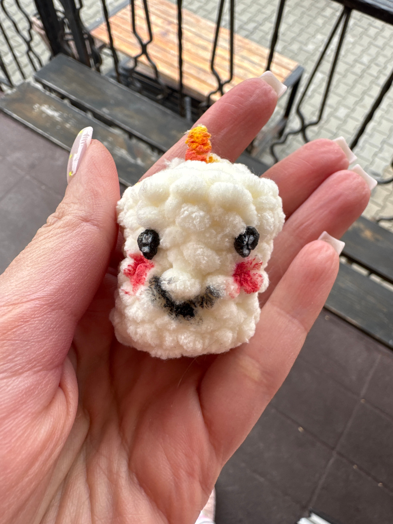 A hand holds a white, square-shaped, crocheted object resembling a face with black eyes, a black smiling mouth, and red cheeks. The person has light skin with a short, square white manicure. A balcony…read more