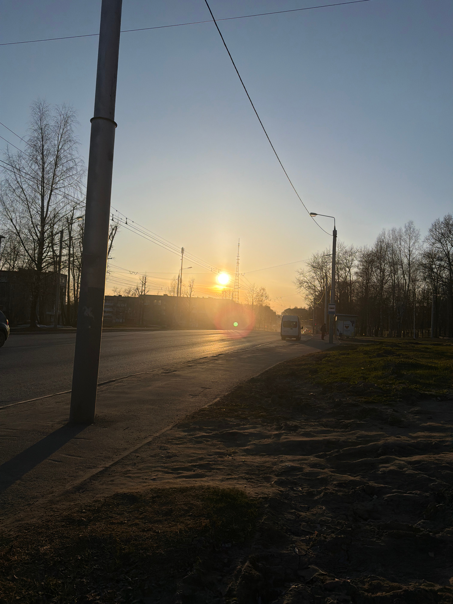 The image shows a sunlit street in Berezniki, Russia. The scene is dominated by the road receding into the distance, with the sun positioned directly ahead, causing a strong glare. The road appears to…read more