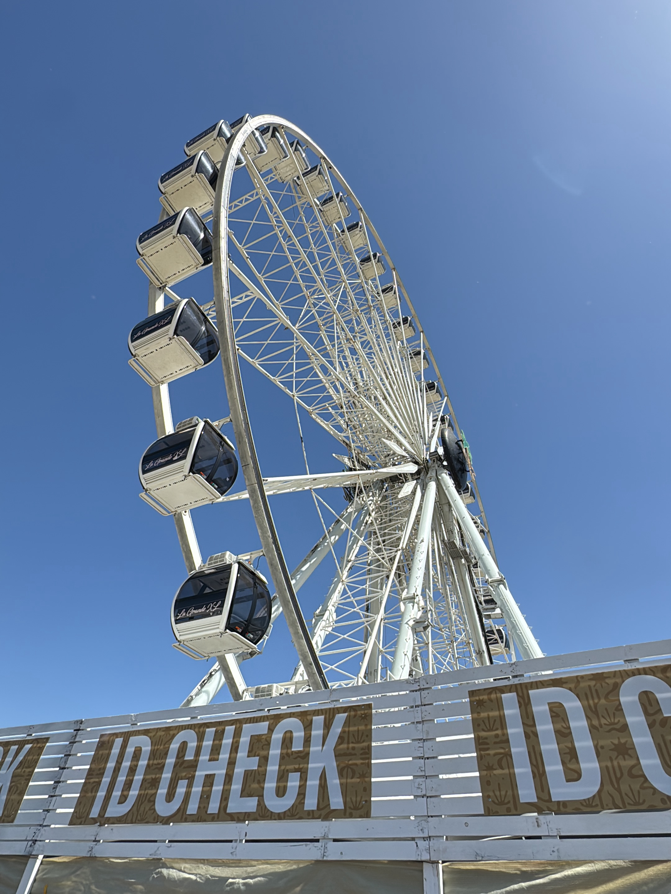 A low-angle, medium shot captures a white Ferris wheel under a clear blue sky. The wheel has enclosed cars, some of which are visible on the left side of the frame. The words "La Grande XL" are printe…read more