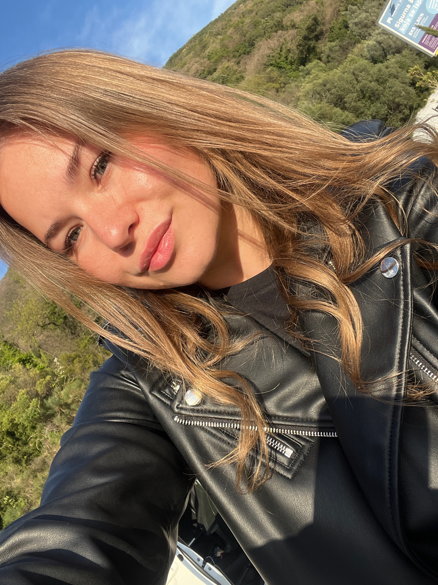 A light-skinned woman with blonde hair is seen in a close-up, rotated headshot, wearing a black leather jacket. The background shows green trees and foliage, along with a blue sky, suggesting an outdo…read more