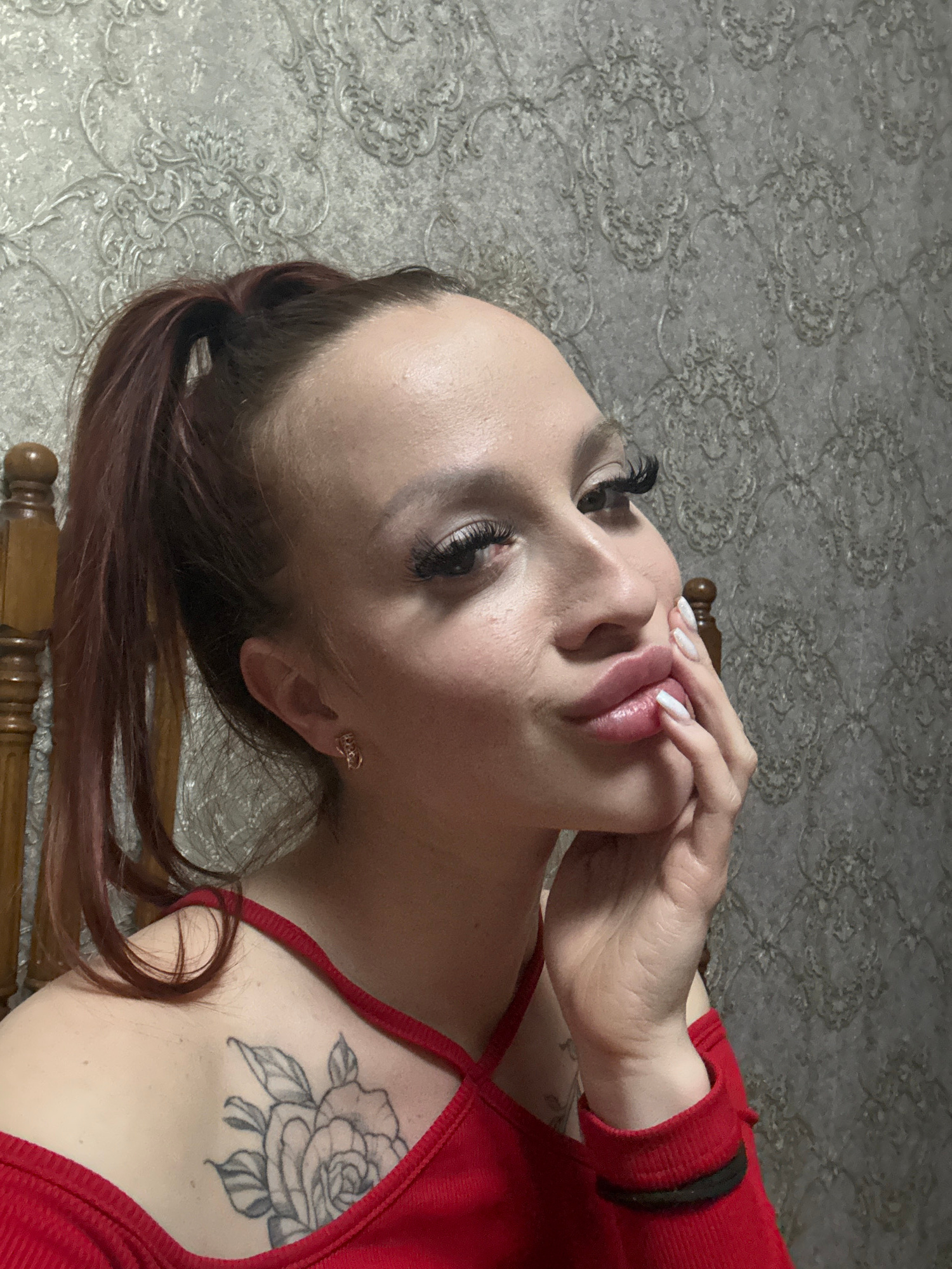 A woman is lying down, facing upward with her head tilted to the left. She has fair skin, dark eyebrows, long dark eyelashes, and dark hair pulled back in a low ponytail. Her lips appear full and glos…read more