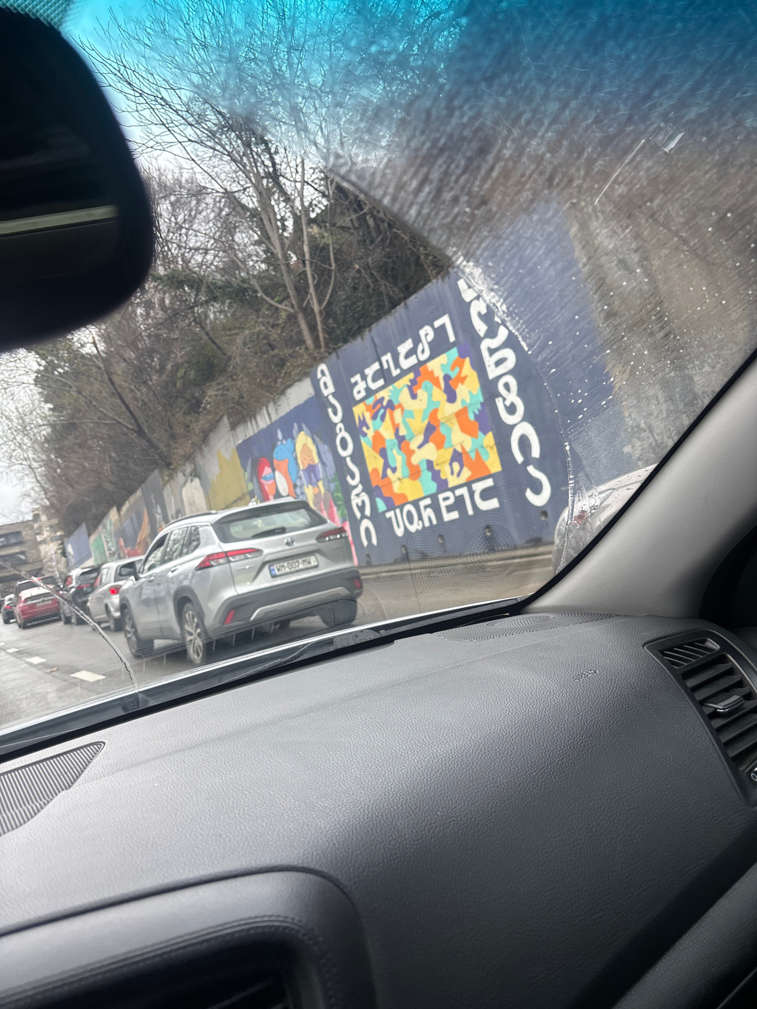 The image captures a street scene from the interior of a vehicle in Tbilisi, Georgia, looking through a rain-splattered windshield. The dark gray dashboard and a portion of the rearview mirror are vis…read more