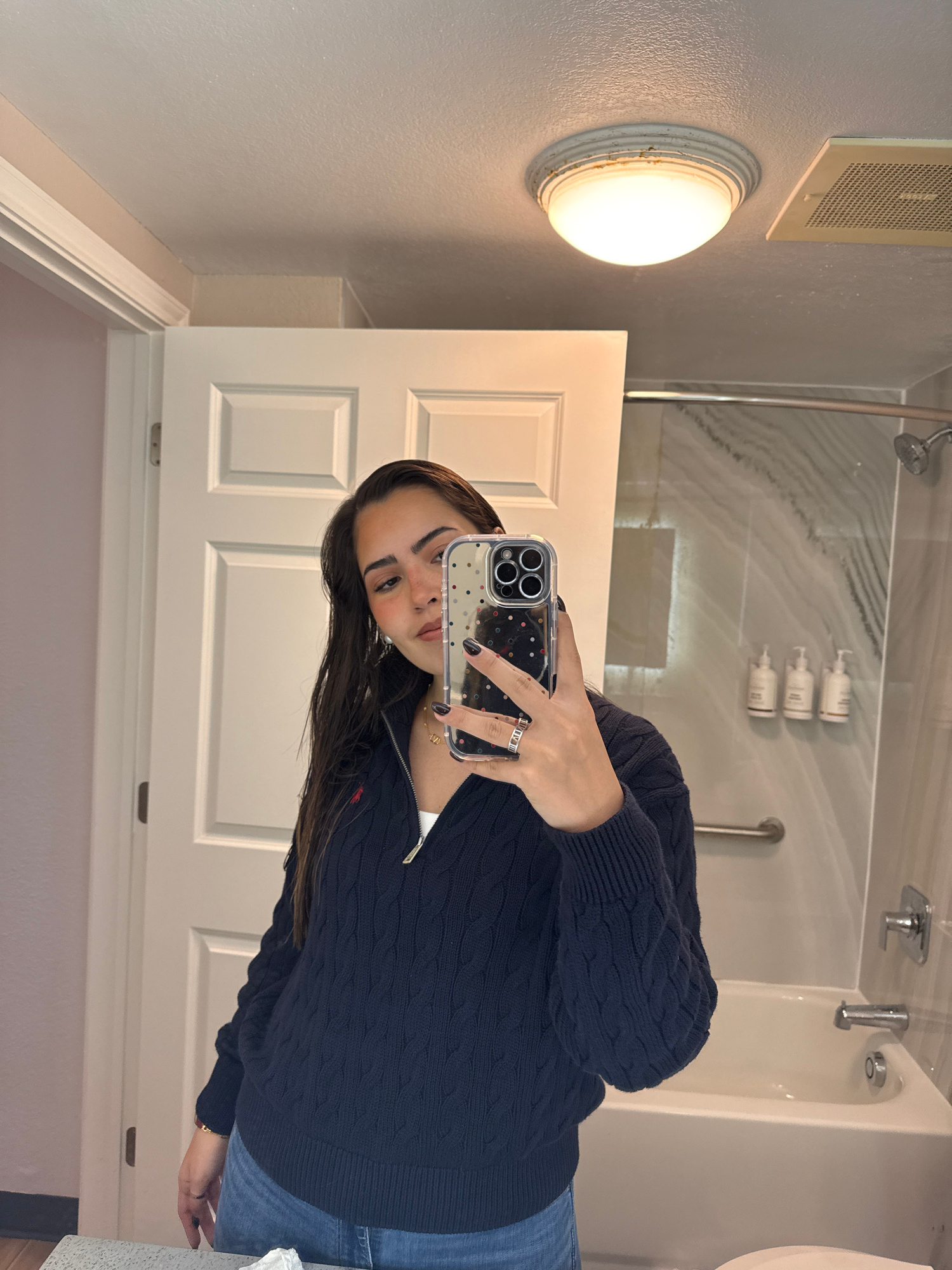 A young woman is taking a selfie in a bathroom. The bathroom features a white door, a shower with a marble-patterned surround, and a light fixture on the wall. Without additional information, it is no…read more