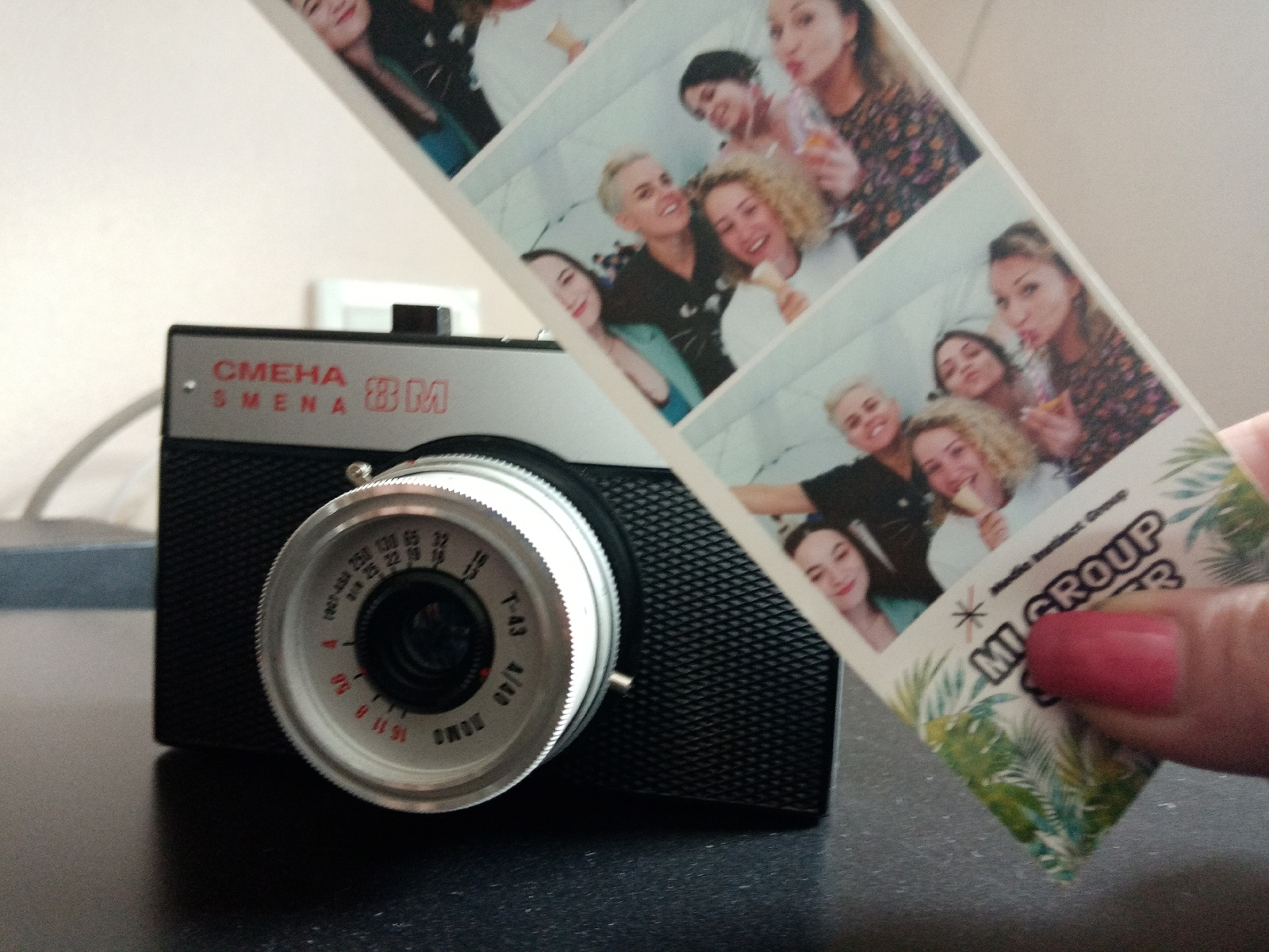 The image displays a vintage Smena 8M film camera positioned on a dark, textured surface, likely a table or countertop. The camera's top plate features "СМЕНА" (Smena in Cyrillic) and "SMENA 8M" in re…read more
