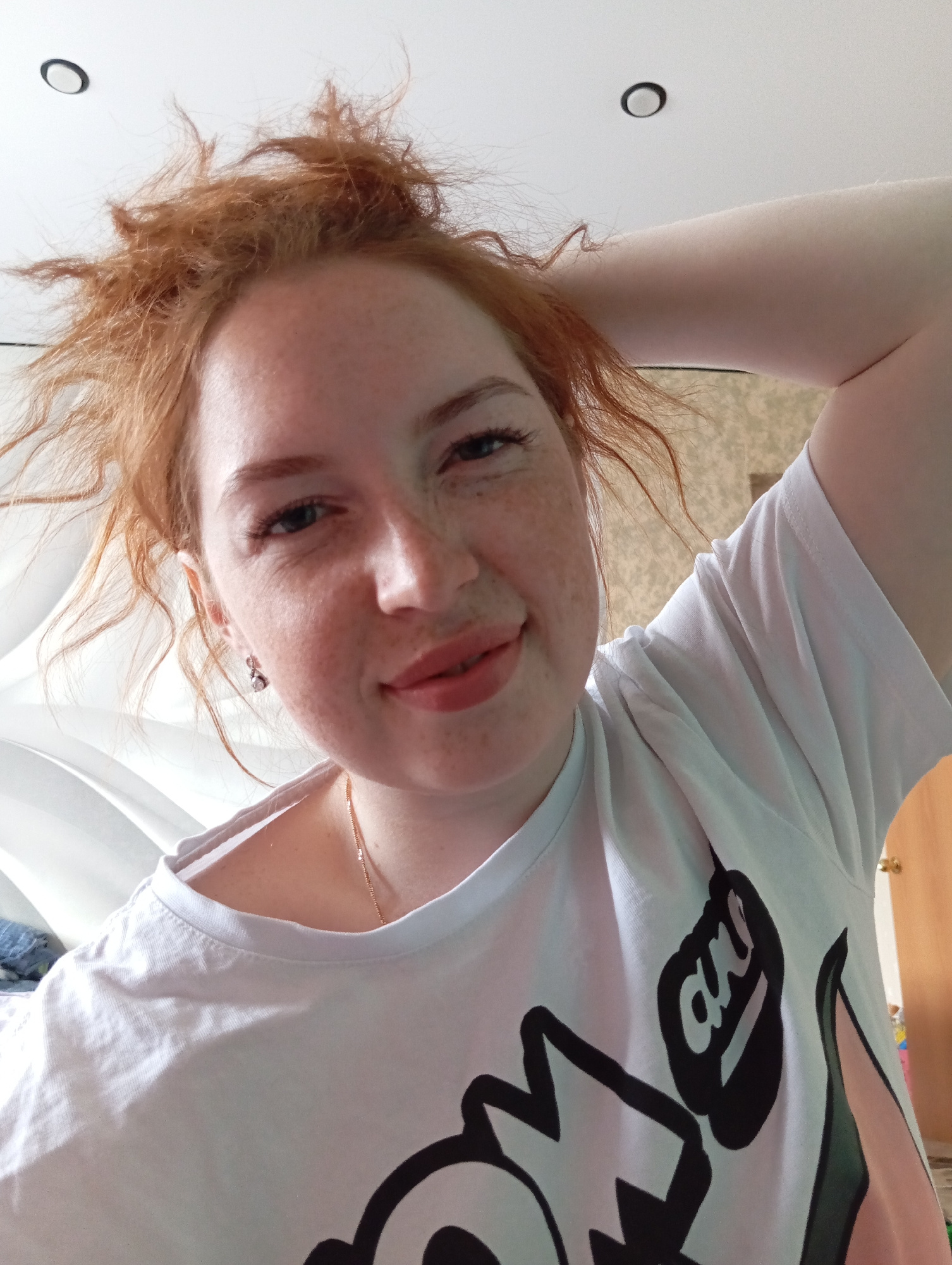 A woman with red hair and freckles is posing for a selfie indoors. She is wearing a white t-shirt with a cartoon design. The background includes a white wall with a round light fixture and a wooden ca…read more