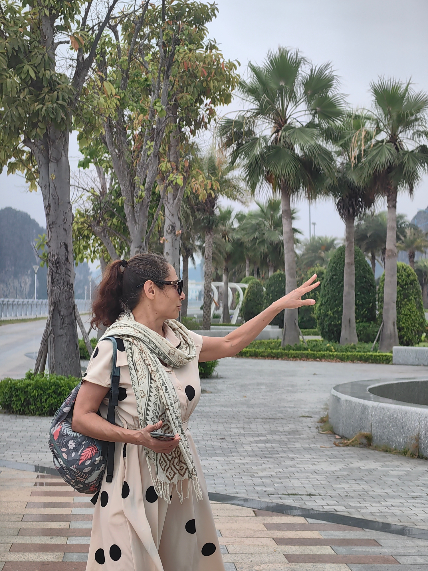 A woman is depicted in a mid-shot, seen in profile as she walks on a paved outdoor pathway in Ha Long Ward, Vietnam. Her dark hair is pulled back in a ponytail, and she wears dark sunglasses. She is dā¦read more