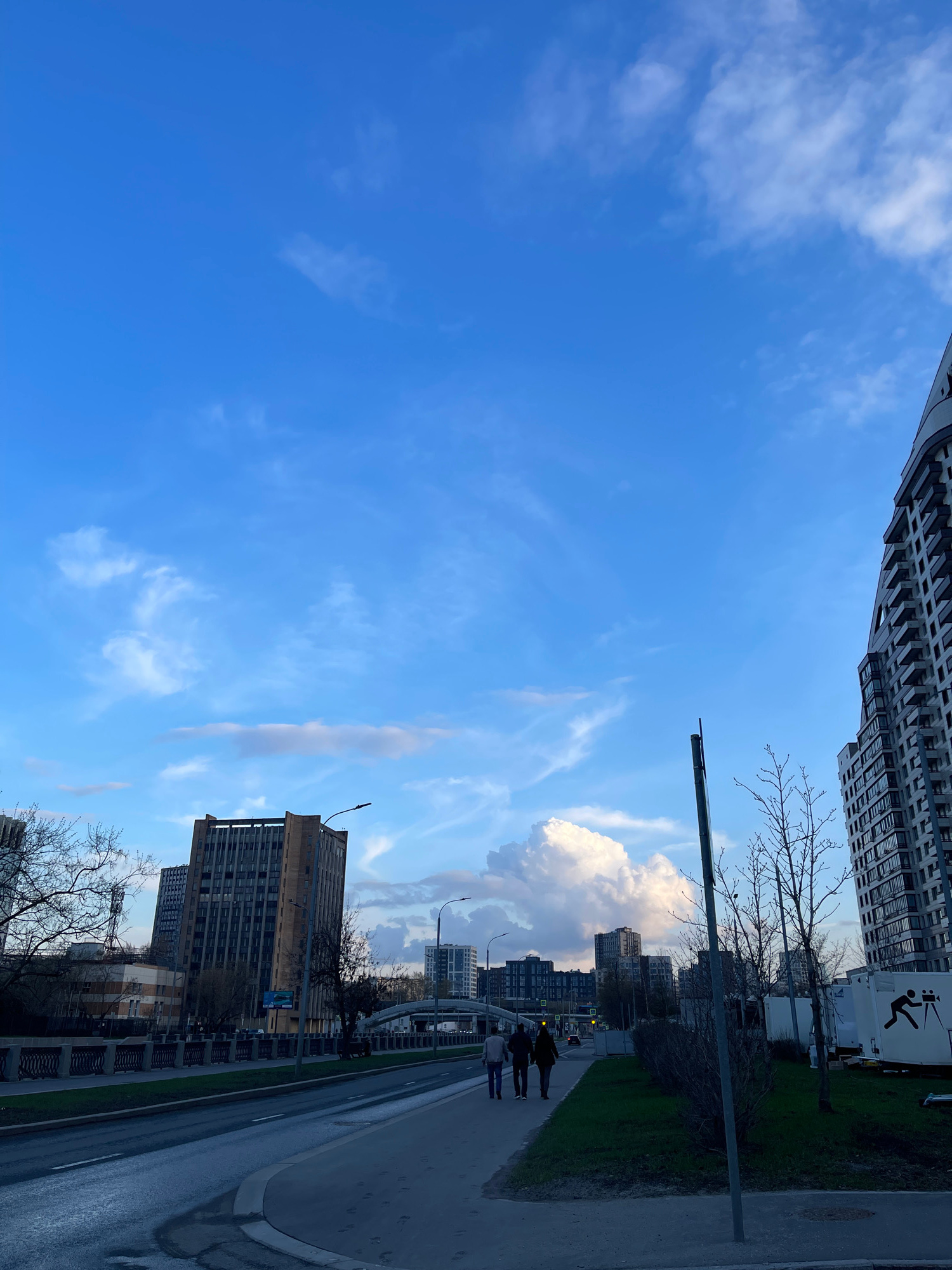 The image is a street-level, vertically-oriented photograph taken outdoors in Moscow, Russia. The viewpoint looks up and along a street lined with modern buildings. The sky is mostly clear blue with wβ¦read more