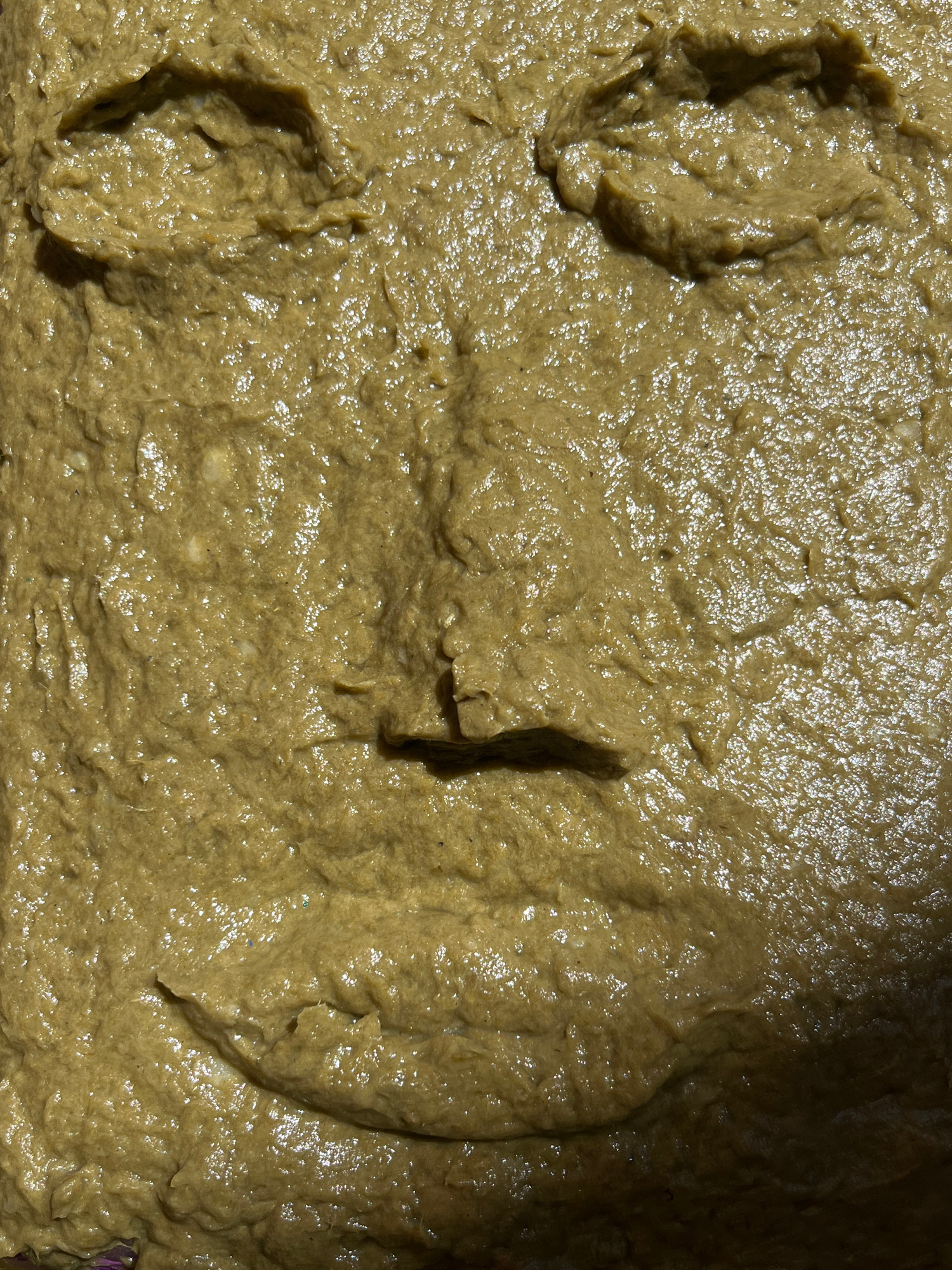 This close-up, top-down image features a thick, viscous, and textured greenish-brown substance, possibly mud or sludge. The surface of the material is highly irregular, displaying numerous lumps, ridg…read more