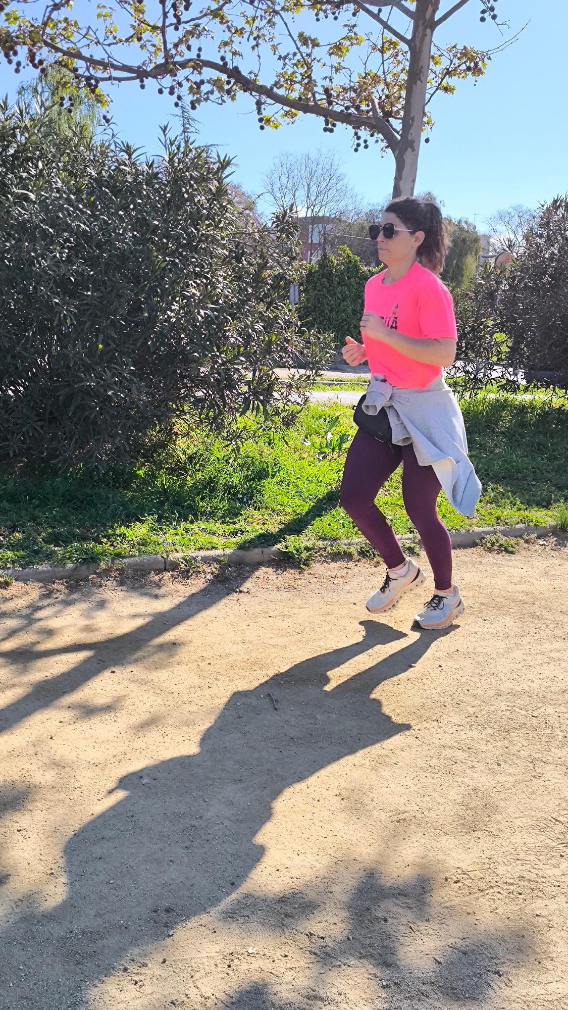 A woman is running in the Parc dels Pinetons, Ripollet, Spain. She is wearing a bright pink t-shirt, dark purple leggings, and running shoes. A light grey sweatshirt is tied around her waist. She is w…read more
