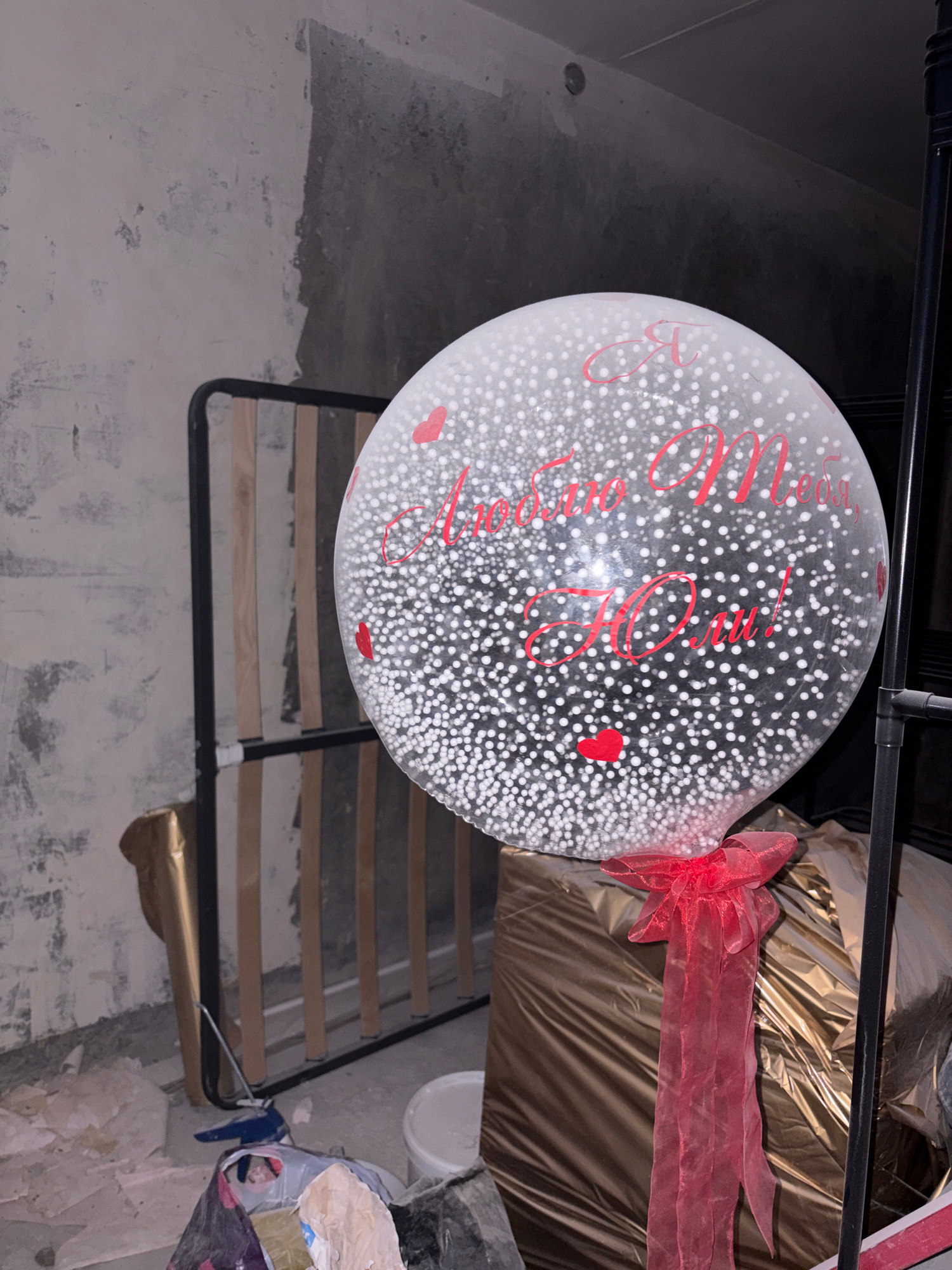 A clear balloon with white polka dots and red writing in Russian hangs from a black metal frame. The writing includes red hearts. A red ribbon is tied at the balloon's neck. The balloon is situated ab…read more