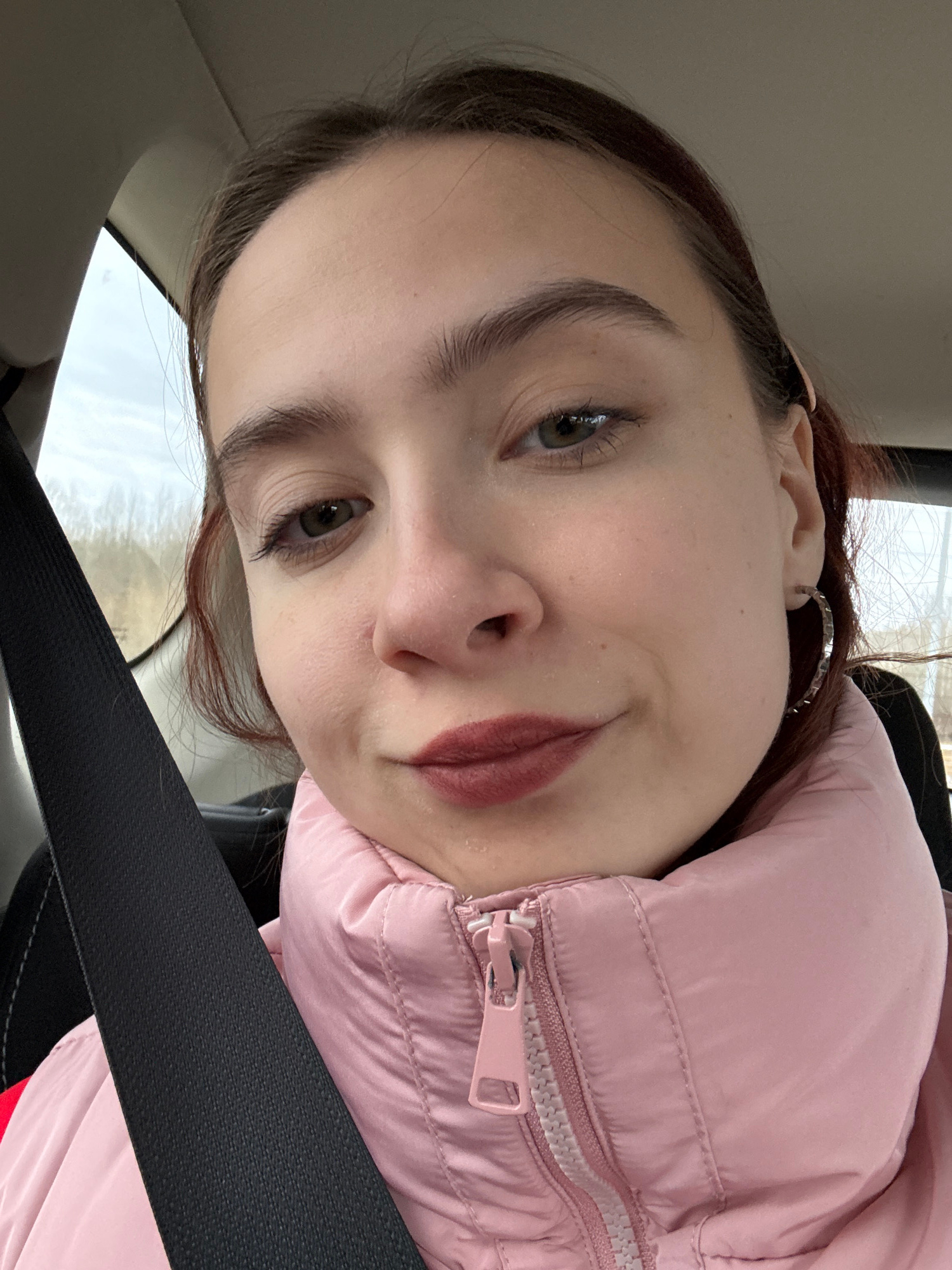 A person with brown hair and green eyes is in a car wearing a pink puffer jacket and a seatbelt. The background is blurry, showing snow and trees. The picture was not taken in Berezniki, Russia.