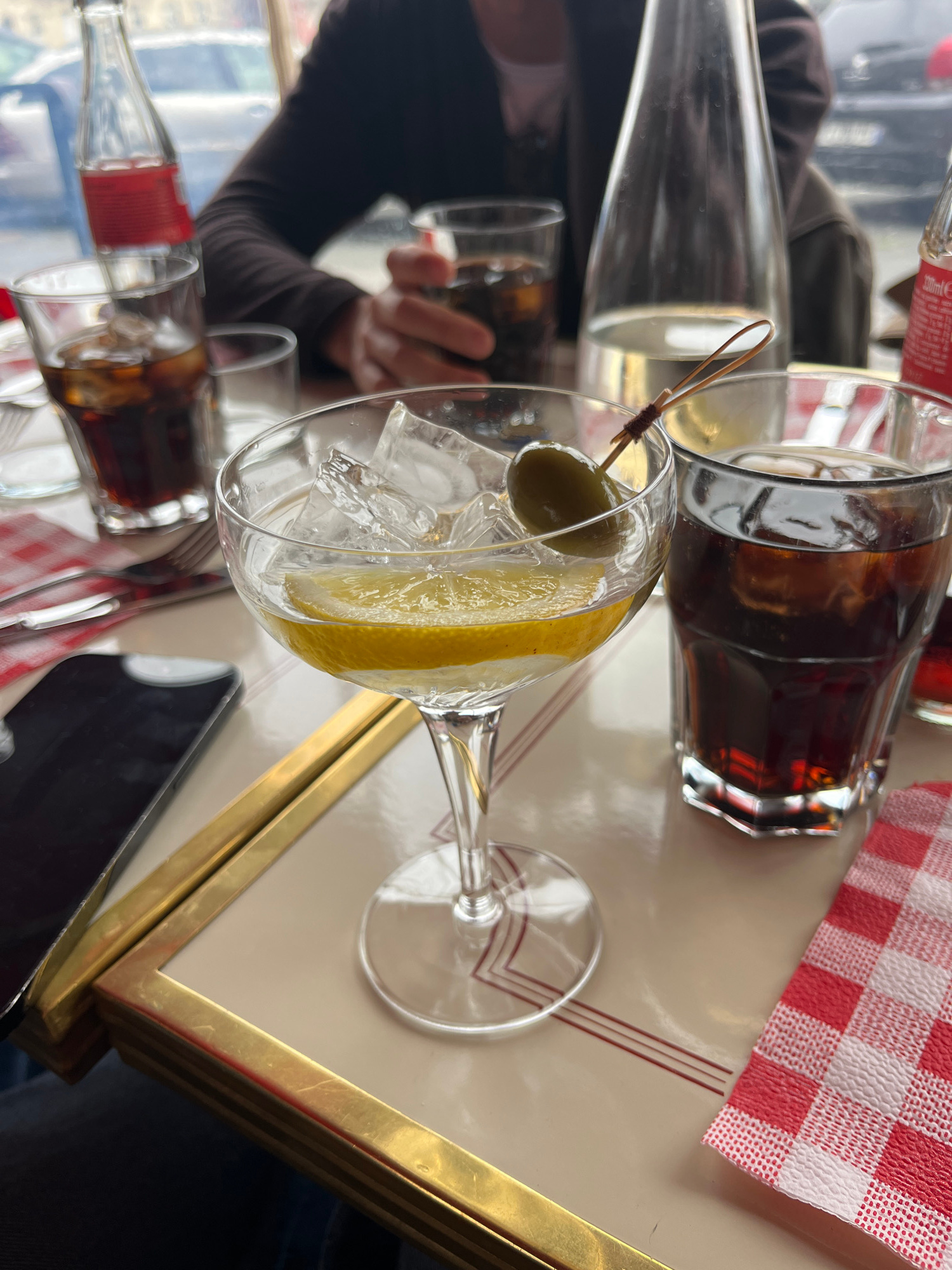 The image captures a scene at a table, possibly in a restaurant or bar, in Bayonne, France. A partially filled martini glass, containing ice, a lemon twist, and an olive on a toothpick, is in the fore…read more