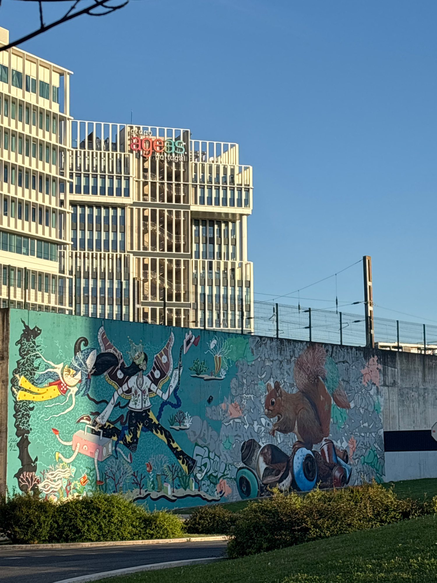 The image captures a modern high-rise building with distinctive architectural features, located in Lisbon, Portugal. The building is predominantly light-colored with repetitive rectangular window unit…read more