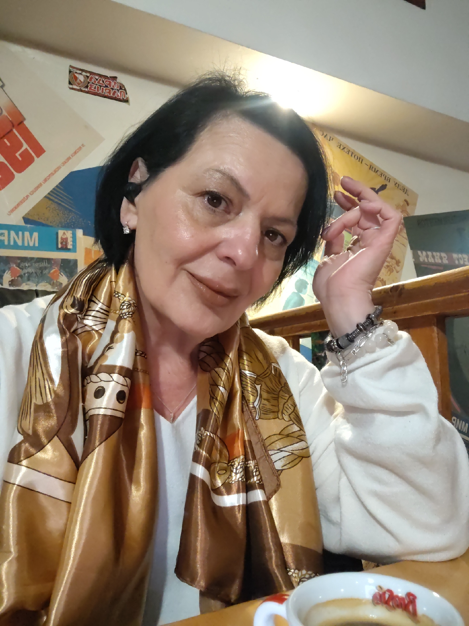 The image is a selfie of a woman in Strasbourg, France. She has short, dark hair and is wearing a white top with a brown and white scarf. She has bracelets on her right wrist and an earring in her lefβ¦read more