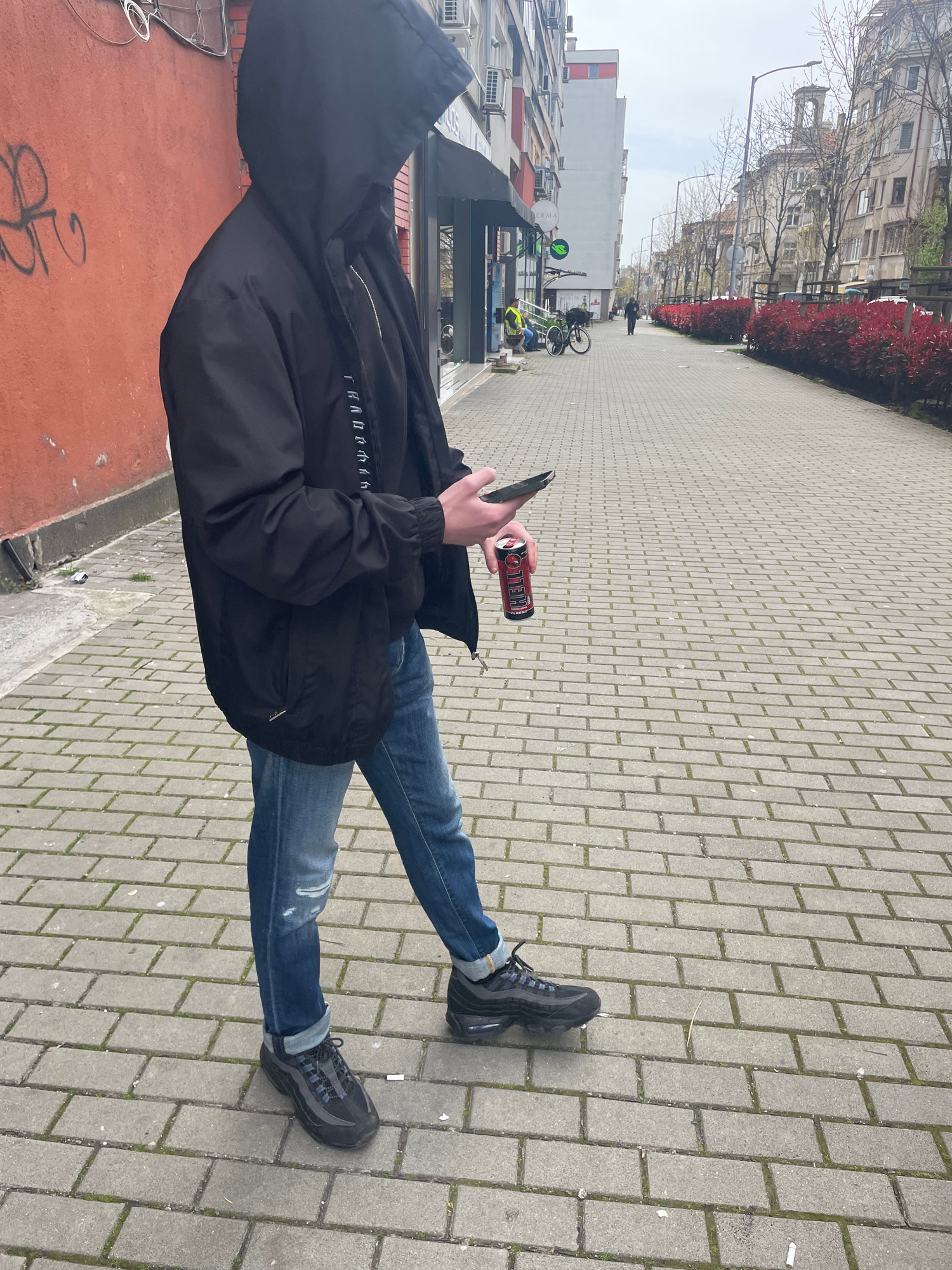 A person stands on a sidewalk in Burgas, Bulgaria. The sidewalk is paved with gray rectangular stones. Buildings line the street. A row of red-leaved bushes grows along the edge of the sidewalk. The p…read more