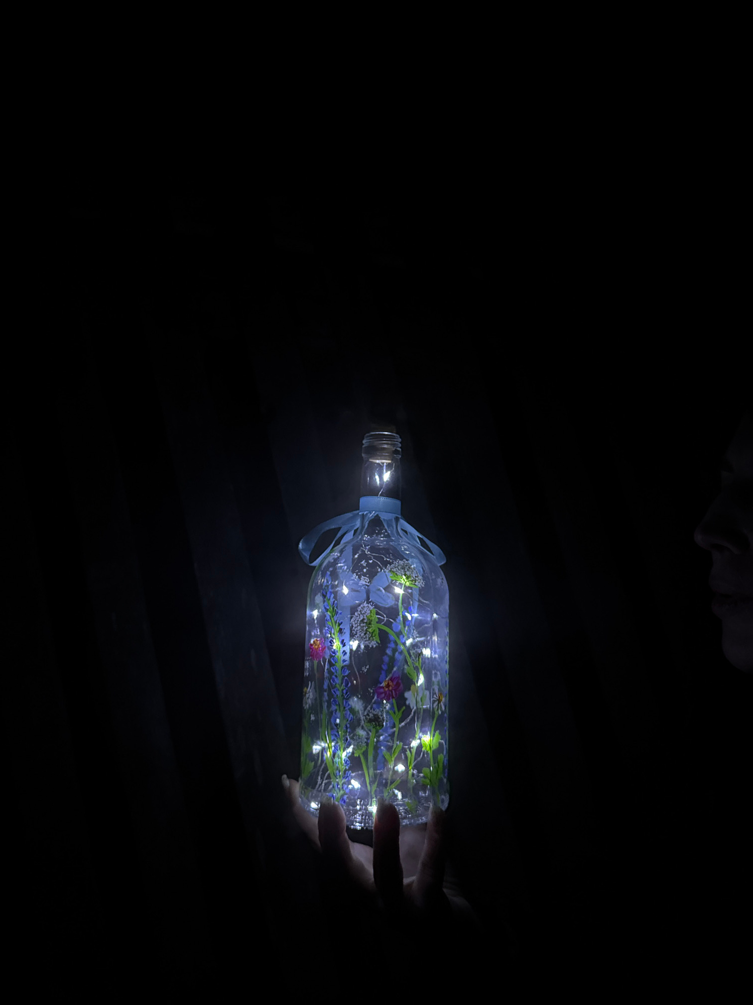 A horizontally-oriented, close-up shot depicts a glass bottle, possibly containing fairy lights and floral elements, being held in the dark by a hand. The bottle is the main source of light in the ima…read more