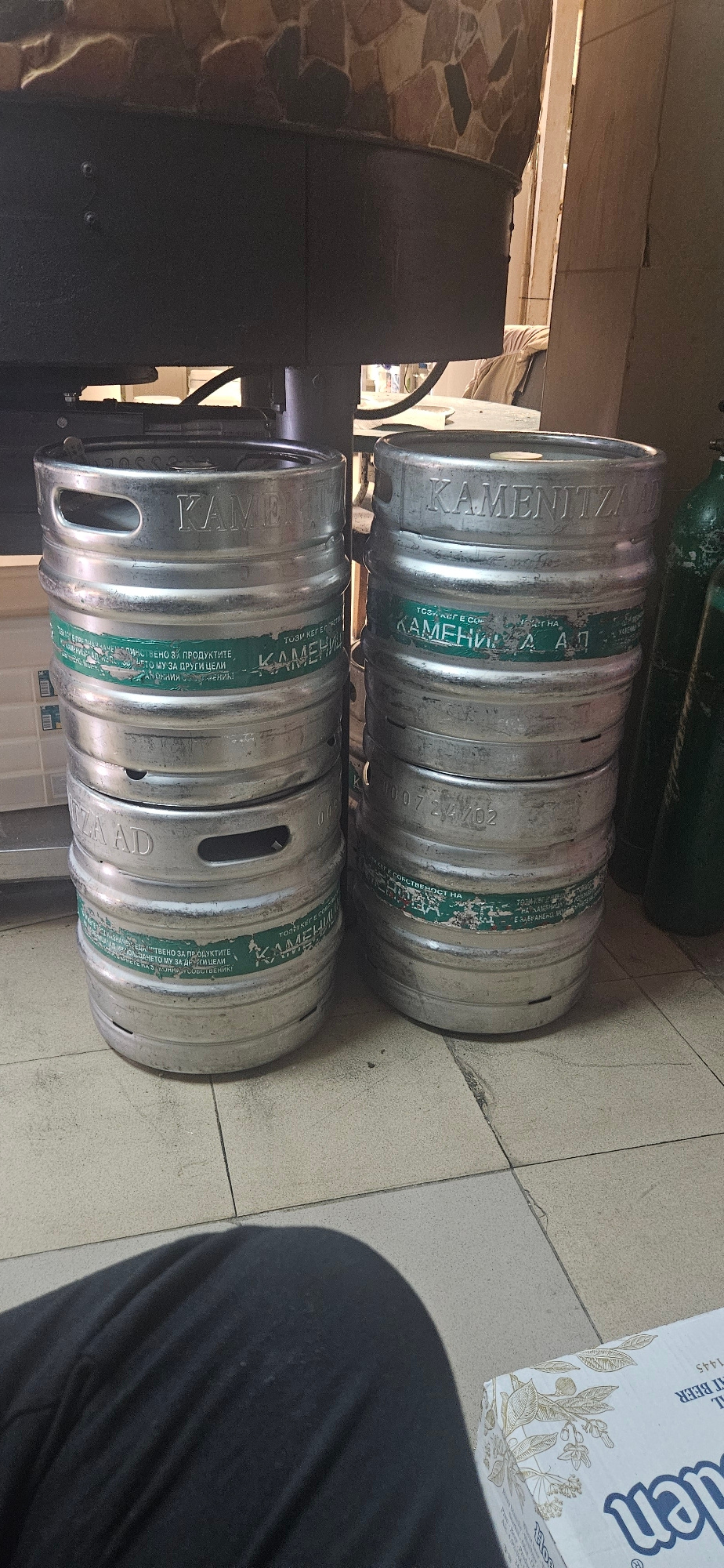 The image captures an indoor scene, likely a storage or service area within a commercial establishment in Sofia, Bulgaria. The main subjects are two large, metallic beer kegs, stacked horizontally on…read more