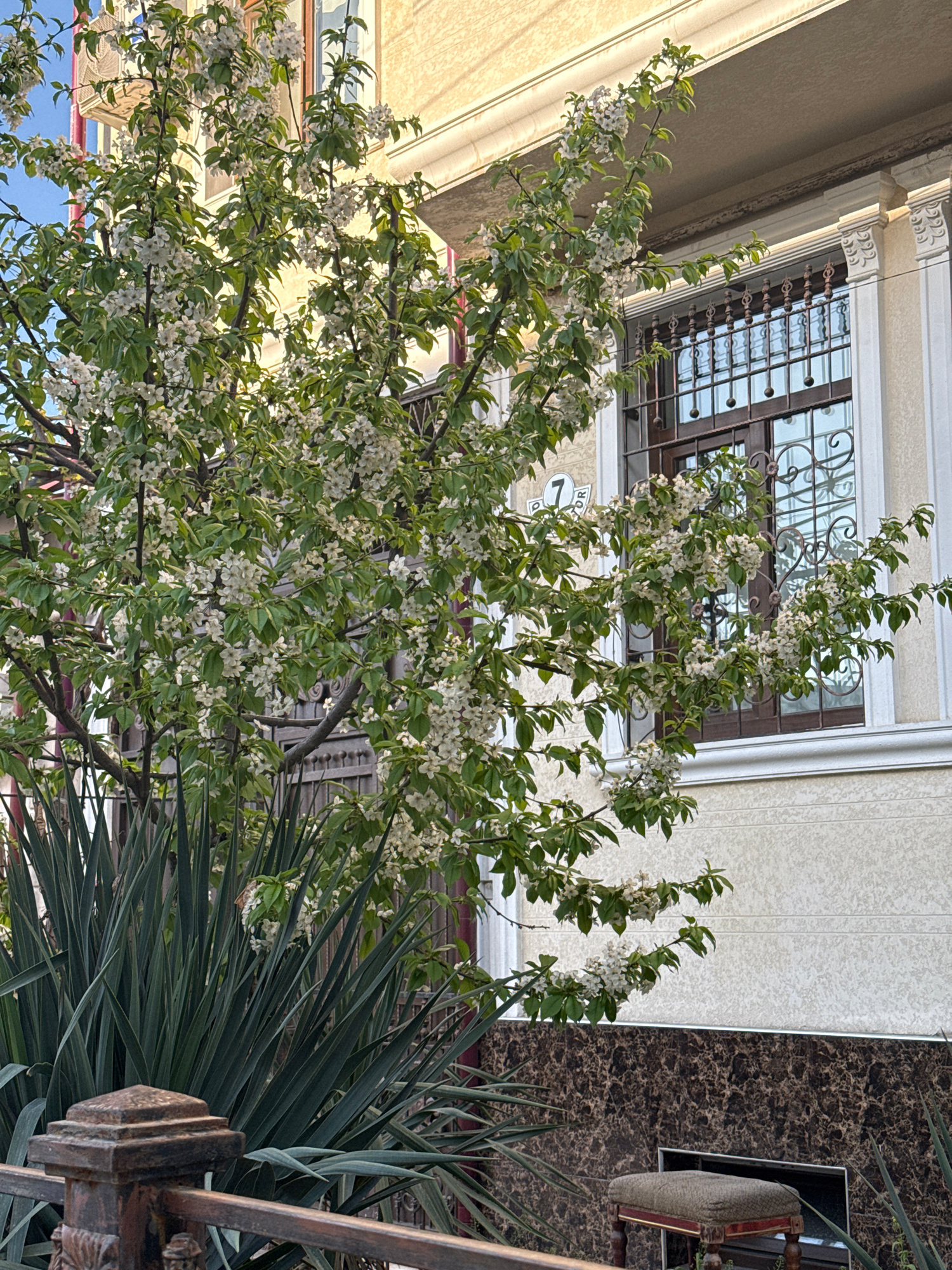 A tree with white flowers stands in front of a building with a window in Tashkent, Uzbekistan. The building has a light-colored facade and a window with dark bars. A palm-like plant is to the right of…read more