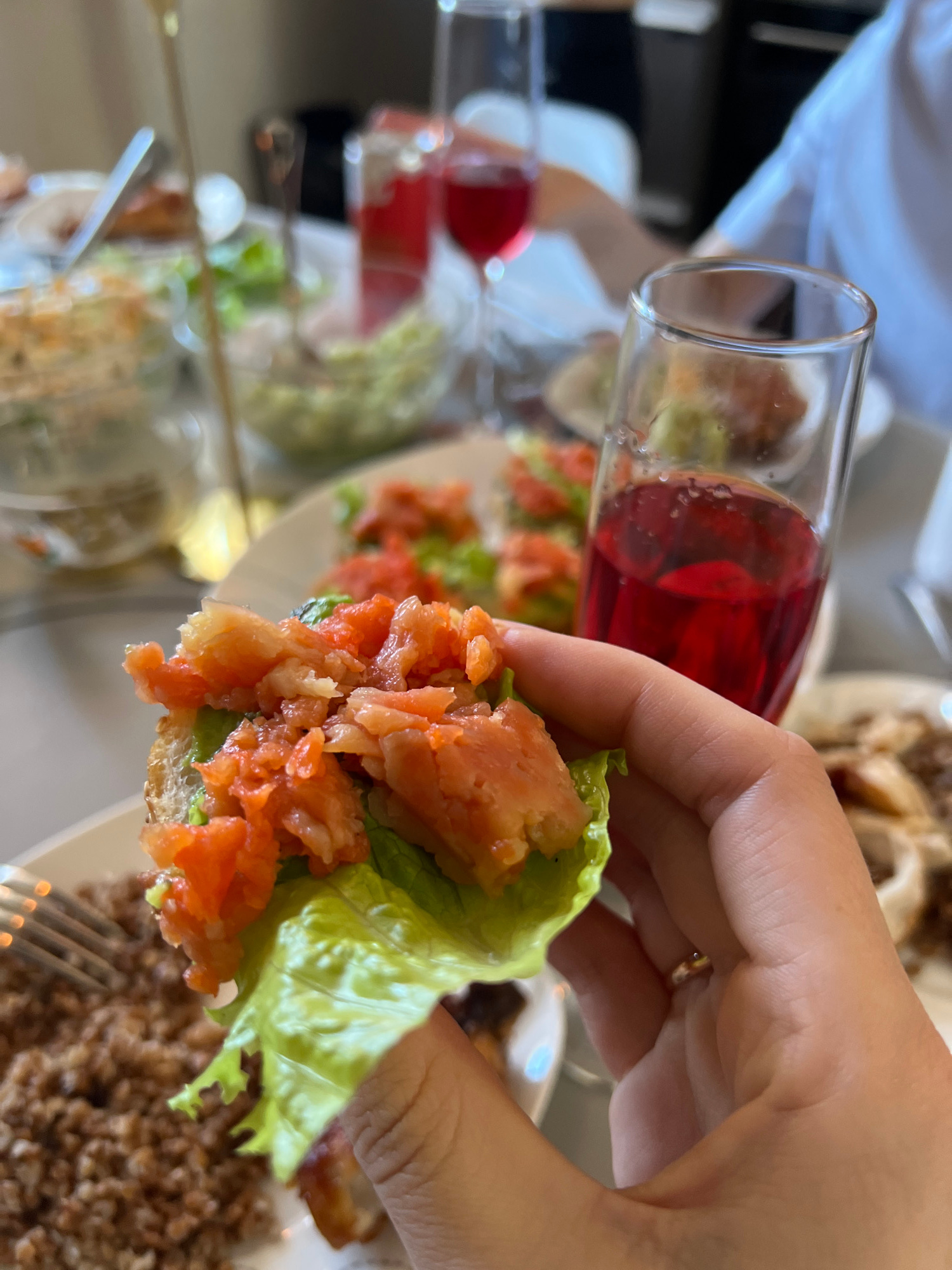 A close-up shot shows a hand holding a lettuce wrap filled with salmon. A glass of red liquid is nearby. The setting appears to be a dining environment, possibly in the city of Tyumen, Russia, based o…read more