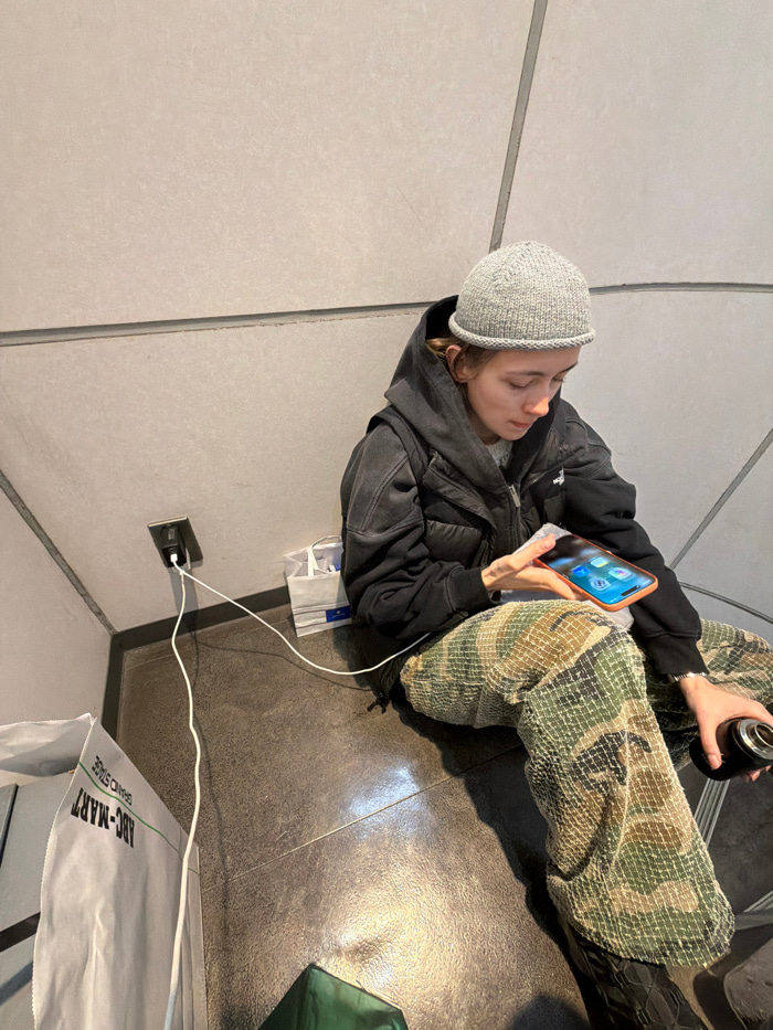 A young individual is seated on a dark tiled floor, leaning against a light gray paneled wall within an indoor commercial or public space in Chuo, Japan. They wear a light gray knit beanie, a dark hoo…read more