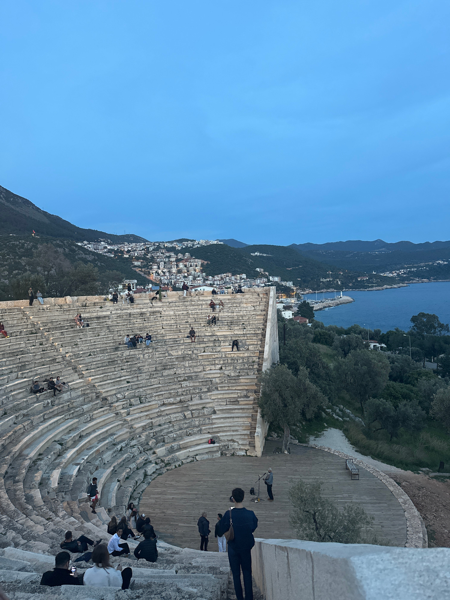 The image captures an aerial view of the ancient theatre in Kaş, Turkey, with people scattered throughout the stone seating area. The theatre faces the sea, with a town nestled between the mountain sl…read more