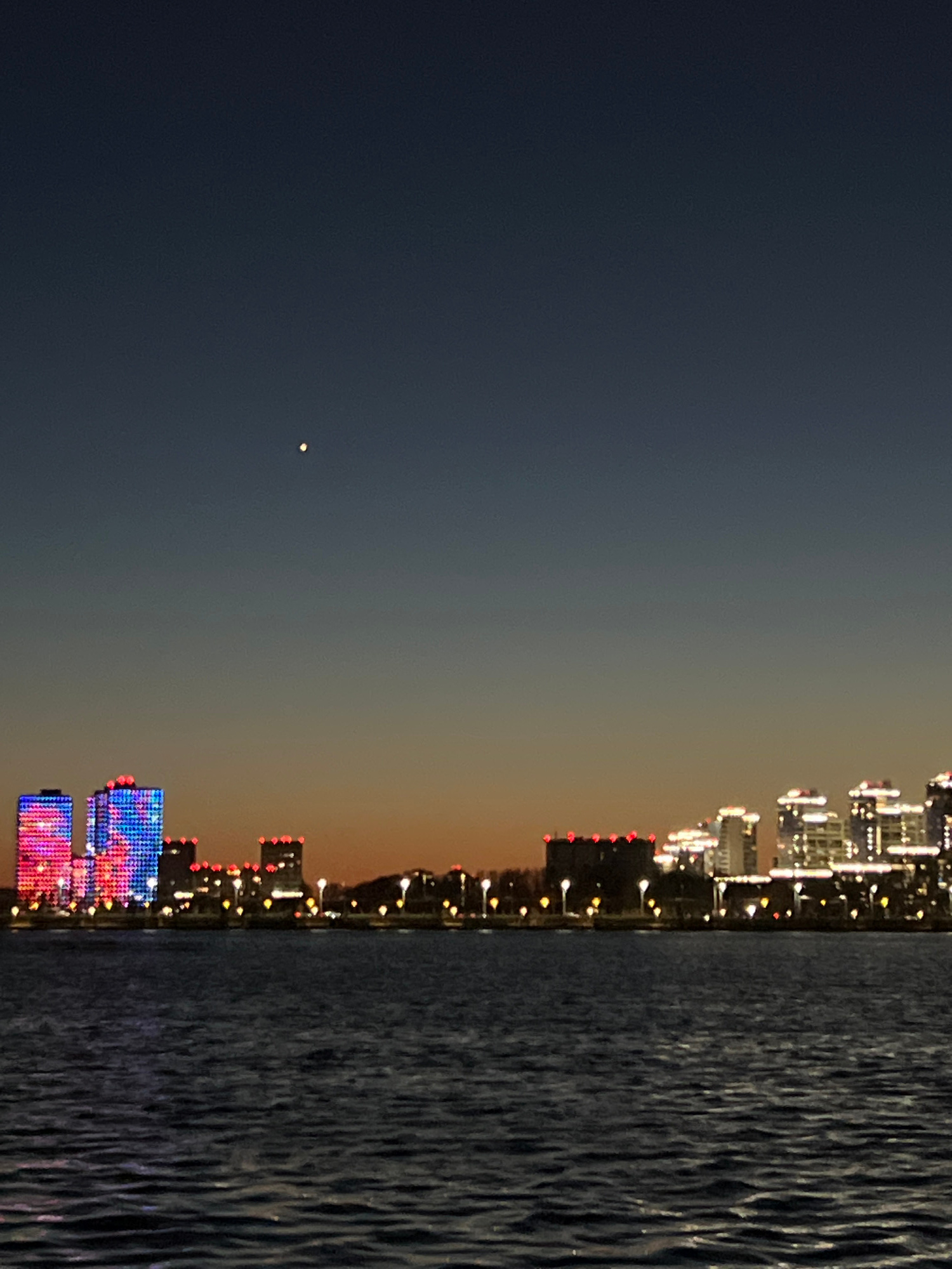 Here's a detailed description of the image: **General Description:** The image depicts a cityscape at night reflected on a body of water. The perspective is somewhat unusual, as the image seems to be rotated ninety degrees clockwise. **Environment:** * **Sky:** Dark gradient, transitioning from a deep blue/black at the top to a lighter tone, likely indicating a dusk or dawn atmosphere. A small bright dot is visible in the dark sky, possibly a star or planet. * **Water:** A body of water takes up the right side of the image. Its surface is textured with ripples and waves that reflect the city lights. * **Cityscape:** A skyline of buildings, illuminated at night, runs along the line where the sky meets the water. **Objects and Subjects:** * **Buildings:** Various buildings of different heights and architectural styles. Some are illuminated with white lights, while others have colored lights (red, blue, and purple are visible). Some of the lower buildings have red lights on top of them, which is common for taller buildings. * **Lights:** A significant number of streetlights or other ground-level lights are interspersed along the skyline. * **Reflection:** The reflections of the buildings and lights are visible on the water surface. **Action and Interactions:** * The lights from the city are reflecting off the water. * There are no discernible people or specific actions taking place in the image, aside from the implied human presence of a city at night. **Location Details:** * The image depicts the city of Kazan, Russia, as evidenced by the unique lighting and architecture visible in the buildings. | Open Wire